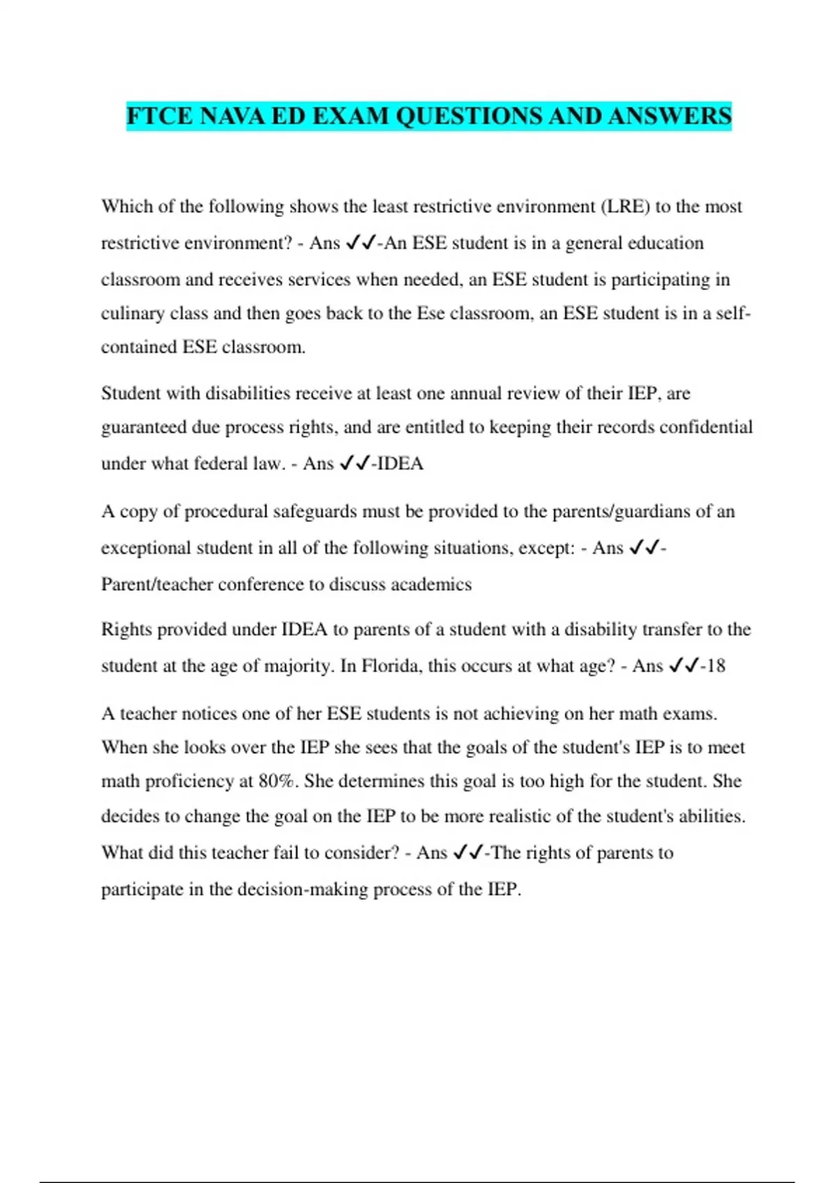 FTCE NAVA ED EXAM QUESTIONS AND ANSWERS Which of the following shows the least restrictive environment (LRE) to the most restrictive environment? - Ans ️️ -An ESE student is in a general education classroom and receives services when needed, an ESE student is participating in culinary class and then goes back to the Ese classroom, an ESE student is in a self- contained ESE classroom. Student with disabilities receive at least one annual review of their IEP, are guaranteed due process rights, and are entitled to keeping their records confidential under what federal law. - Ans ️️ -IDEA A copy of procedural safeguards must be provided to the parents/guardians of an exceptional student in all of the following situations, except: - Ans ️️ - Parent/teacher conference to discuss academics Rights provided under IDEA to parents of a student with a disability transfer to the student at the age of majority. In Florida, this occurs at what age? - Ans ️️ -18 A teacher notices one of her ESE students is not achieving on her math exams. When she looks over the IEP she sees that the goals of the student's IEP is to meet math proficiency at 80%. She determines this goal is too high for the student. She decides to change the goal on the IEP to be more realistic of the student's abilities. What did this teacher fail to consider? - Ans ️️ -The rights of parents to participate in the decision-making process of the IEP