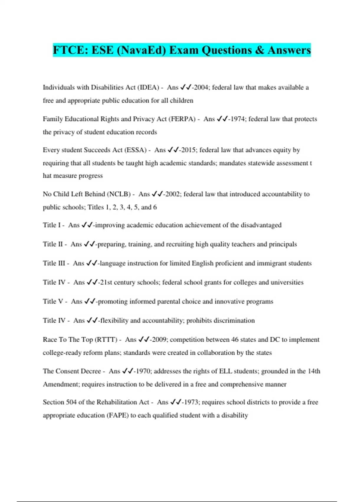 FTCE: ESE (NavaEd) Exam Questions & Answers Individuals with Disabilities Act (IDEA) - Ans ️️ -2004; federal law that makes available a free and appropriate public education for all children Family Educational Rights and Privacy Act (FERPA) - Ans ️️ -1974; federal law that protects the privacy of student education records Every student Succeeds Act (ESSA) - Ans ️️ -2015; federal law that advances equity by requiring that all students be taught high academic standards; mandates statewide assessment t hat measure progress No Child Left Behind (NCLB) - Ans ️️ -2002; federal law that introduced accountability to public schools; Titles 1, 2, 3, 4, 5, and 6 Title I - Ans ️️ -improving academic education achievement of the disadvantaged Title II - Ans ️️ -preparing, training, and recruiting high quality teachers and principals Title III - Ans ️️ -language instruction for limited English proficient and immigrant students Title IV - Ans ️️ -21st century schools; federal school grants for colleges and universities Title V - Ans ️️ -promoting informed parental choice and innovative programs Title IV - Ans ️️ -flexibility and accountability; prohibits discrimination Race To The Top (RTTT) - Ans ️️ -2009; competition between 46 states and DC to implement college-ready reform plans; standards were created in collaboration by the states The Consent Decree - Ans ️️ -1970; addresses the rights of ELL students; grounded in the 14th Amendment; requires instruction to be delivered in a free and comprehensive manner Section 504 of the Rehabilitation Act - Ans ️️ -1973; requires school districts to provide a free appropriate education (FAPE) to each qualified student with a disability
