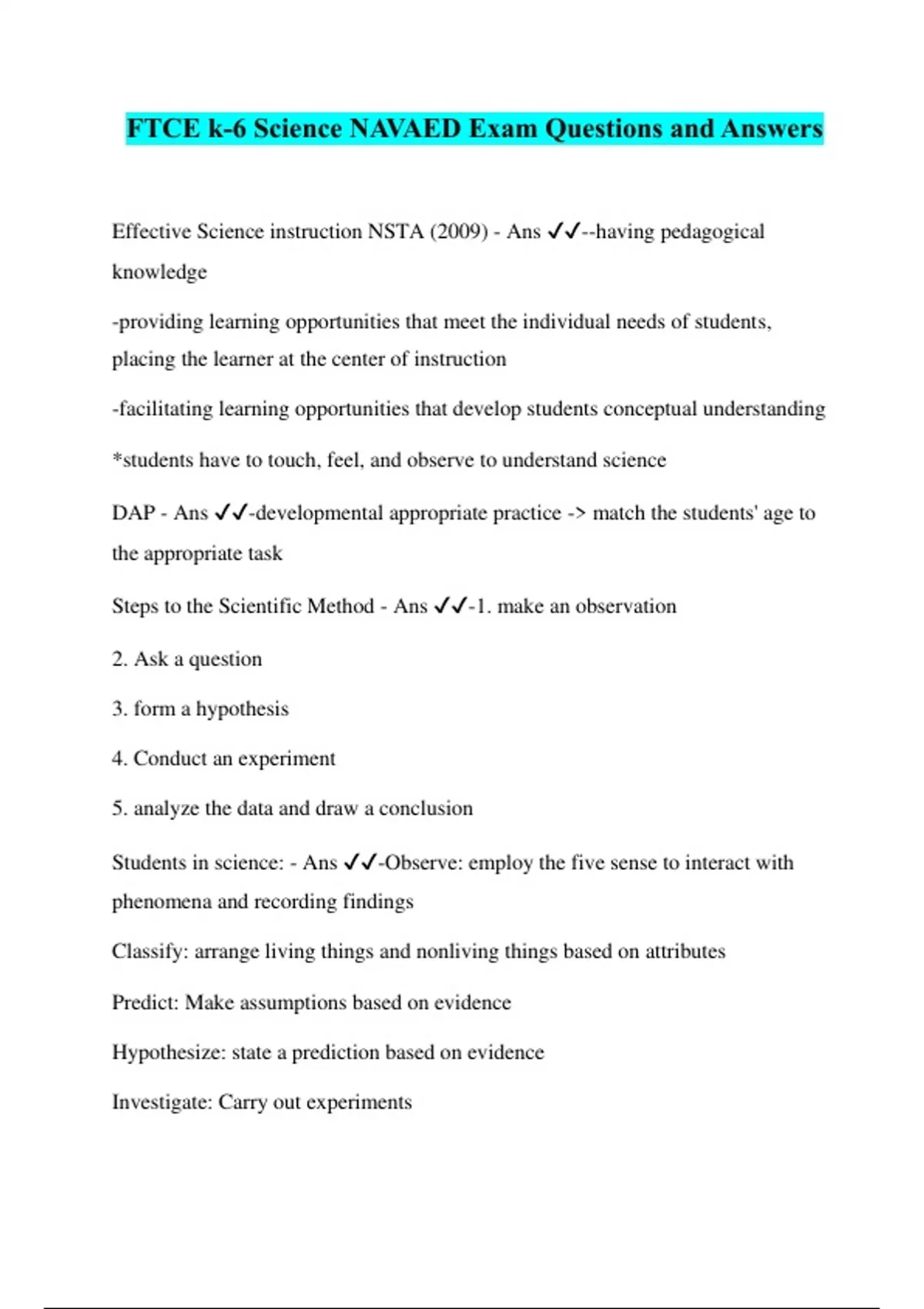 FTCE k-6 Science NAVAED Exam Questions and Answers Effective Science instruction NSTA (2009) - Ans ️️ --having pedagogical knowledge -providing learning opportunities that meet the individual needs of students, placing the learner at the center of instruction -facilitating learning opportunities that develop students conceptual understanding *students have to touch, feel, and observe to understand science DAP - Ans ️️ -developmental appropriate practice -> match the students' age to the appropriate task Steps to the Scientific Method - Ans ️️ -1. make an observation 2. Ask a question 3. form a hypothesis 4. Conduct an experiment 5. analyze the data and draw a conclusion Students in science: - Ans ️️ -Observe: employ the five sense to interact with phenomena and recording findings Classify: arrange living things and nonliving things based on attributes Predict: Make assumptions based on evidence Hypothesize: state a prediction based on evidence Investigate: Carry out experiments