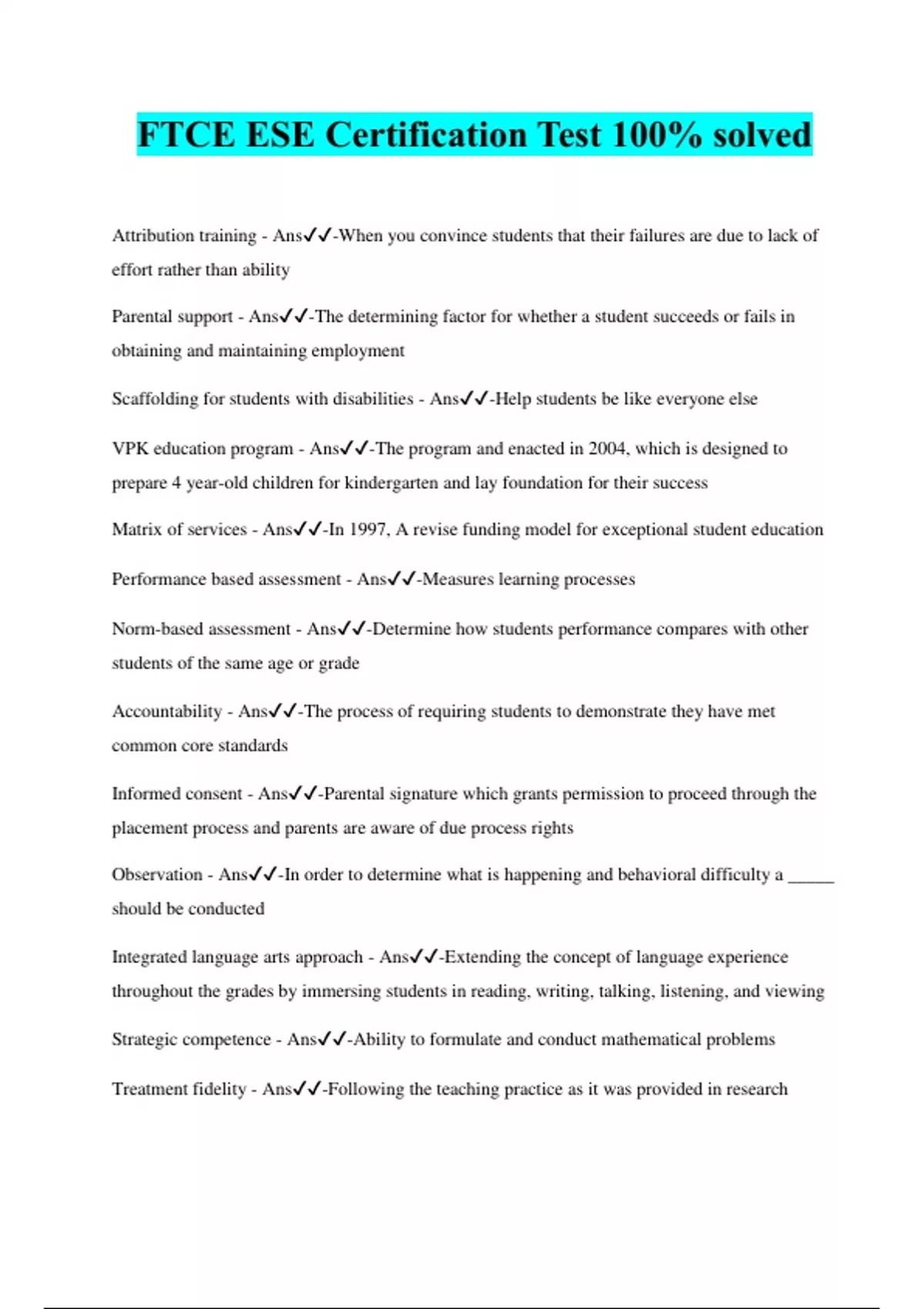 FTCE ESE Certification Test 100% solved Attribution training - Ans️️ -When you convince students that their failures are due to lack of effort rather than ability Parental support - Ans️️ -The determining factor for whether a student succeeds or fails in obtaining and maintaining employment Scaffolding for students with disabilities - Ans️️ -Help students be like everyone else VPK education program - Ans️️ -The program and enacted in 2004, which is designed to prepare 4 year-old children for kindergarten and lay foundation for their success Matrix of services - Ans️️ -In 1997, A revise funding model for exceptional student education Performance based assessment - Ans️️ -Measures learning processes Norm-based assessment - Ans️️ -Determine how students performance compares with other students of the same age or grade Accountability - Ans️️ -The process of requiring students to demonstrate they have met common core standards Informed consent - Ans️️ -Parental signature which grants permission to proceed through the placement process and parents are aware of due process rights Observation - Ans️️ -In order to determine what is happening and behavioral difficulty a _____ should be conducted Integrated language arts approach - Ans️️ -Extending the concept of language experience throughout the grades by immersing students in reading, writing, talking, listening, and viewing Strategic competence - Ans️️ -Ability to formulate and conduct mathematical problems Treatment fidelity - Ans️️ -Following the teaching practice as it was provided in research