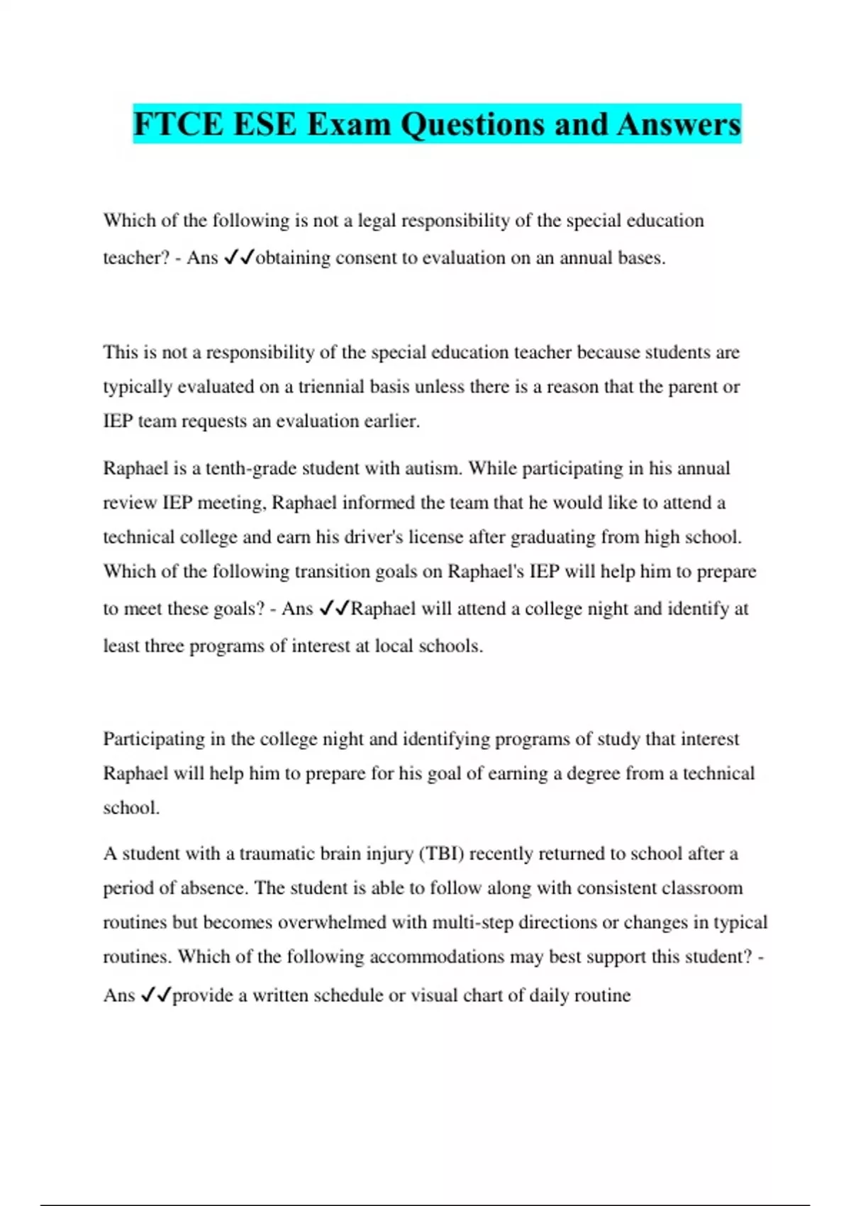 FTCE ESE Exam Questions and Answers Which of the following is not a legal responsibility of the special education teacher? - Ans ️️ obtaining consent to evaluation on an annual bases. This is not a responsibility of the special education teacher because students are typically evaluated on a triennial basis unless there is a reason that the parent or IEP team requests an evaluation earlier. Raphael is a tenth-grade student with autism. While participating in his annual review IEP meeting, Raphael informed the team that he would like to attend a technical college and earn his driver's license after graduating from high school. Which of the following transition goals on Raphael's IEP will help him to prepare to meet these goals? - Ans ️️ Raphael will attend a college night and identify at least three programs of interest at local schools. Participating in the college night and identifying programs of study that interest Raphael will help him to prepare for his goal of earning a degree from a technical school. A student with a traumatic brain injury (TBI) recently returned to school after a period of absence. The student is able to follow along with consistent classroom routines but becomes overwhelmed with multi-step directions or changes in typical routines. Which of the following accommodations may best support this student? - Ans ️️ provide a written schedule or visual chart of daily routine