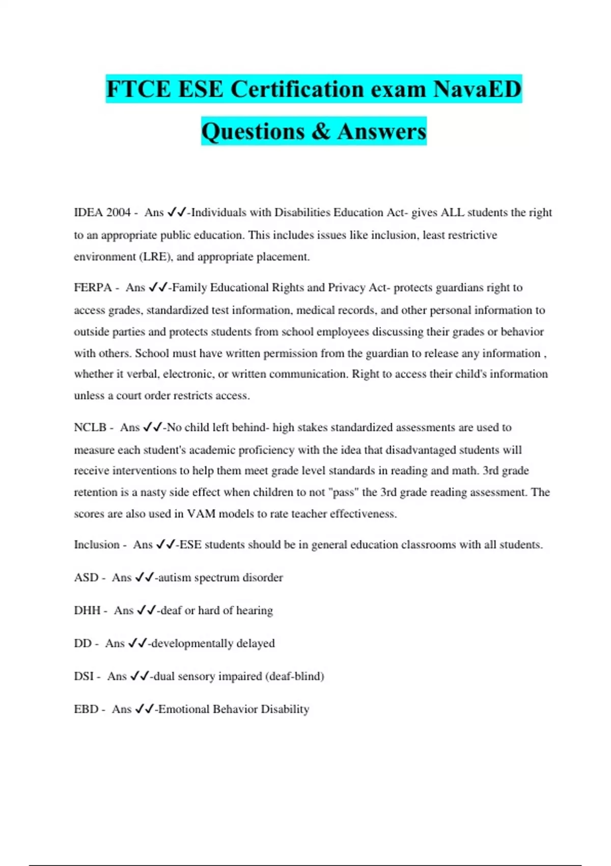 FTCE ESE Certification exam NavaED Questions & Answers IDEA 2004 - Ans ️️ -Individuals with Disabilities Education Act- gives ALL students the right to an appropriate public education. This includes issues like inclusion, least restrictive environment (LRE), and appropriate placement. FERPA - Ans ️️ -Family Educational Rights and Privacy Act- protects guardians right to access grades, standardized test information, medical records, and other personal information to outside parties and protects students from school employees discussing their grades or behavior with others. School must have written permission from the guardian to release any information , whether it verbal, electronic, or written communication. Right to access their child's information unless a court order restricts access. NCLB - Ans ️️ -No child left behind- high stakes standardized assessments are used to measure each student's academic proficiency with the idea that disadvantaged students will receive interventions to help them meet grade level standards in reading and math. 3rd grade retention is a nasty side effect when children to not "pass" the 3rd grade reading assessment. The scores are also used in VAM models to rate teacher effectiveness. Inclusion - Ans ️️ -ESE students should be in general education classrooms with all students. ASD - Ans ️️ -autism spectrum disorder DHH - Ans ️️ -deaf or hard of hearing DD - Ans ️️ -developmentally delayed DSI - Ans ️️ -dual sensory impaired (deaf-blind) EBD - Ans ️️ -Emotional Behavior Disability