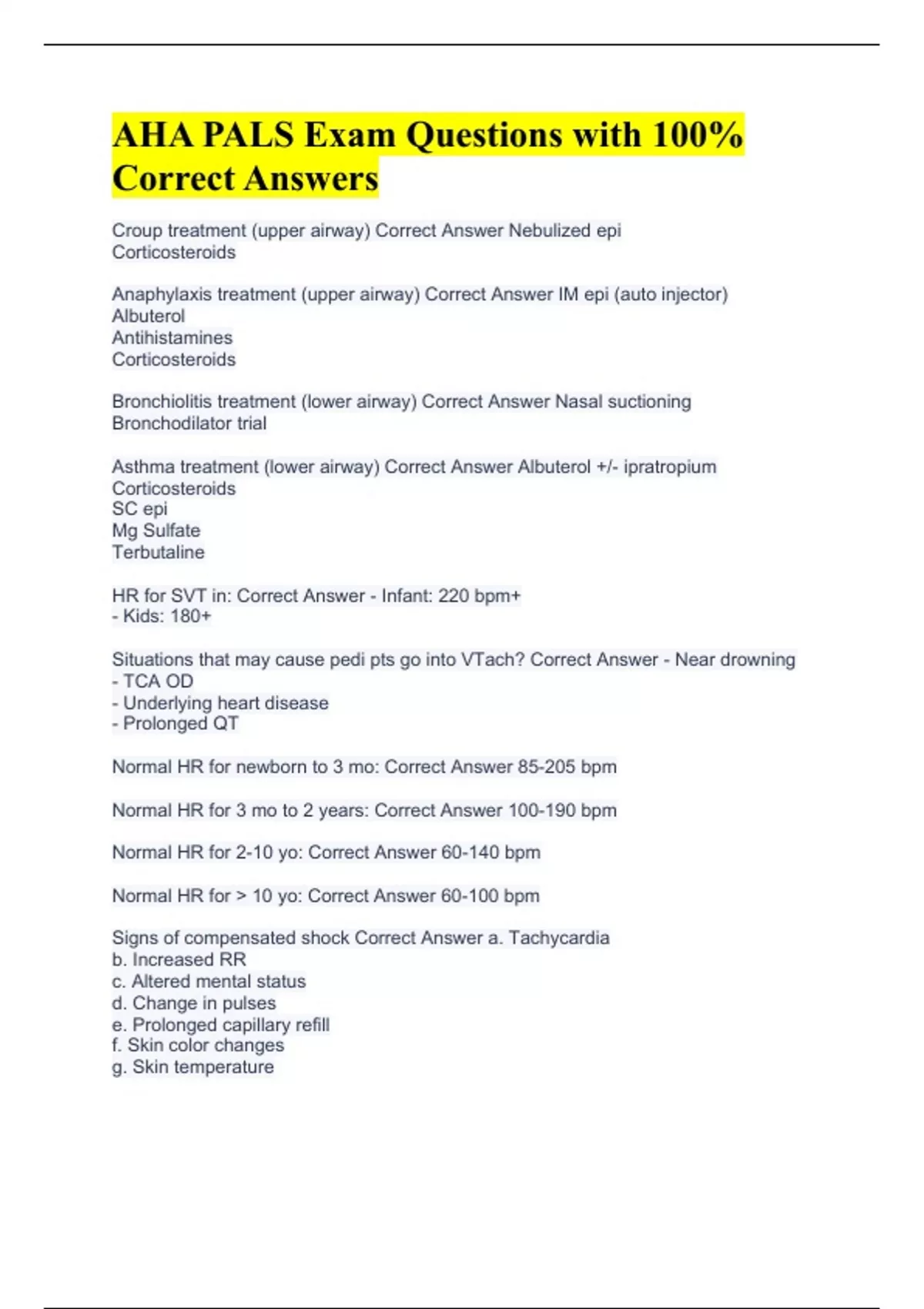Croup treatment (upper airway) Correct Answer Nebulized epi Corticosteroids Anaphylaxis treatment (upper airway) Correct Answer IM epi (auto injector) Albuterol Antihistamines Corticosteroids Bronchiolitis treatment (lower airway) Correct Answer Nasal suctioning Bronchodilator trial Asthma treatment (lower airway) Correct Answer Albuterol +/- ipratropium Corticosteroids SC epi Mg Sulfate Terbutaline HR for SVT in: Correct Answer - Infant: 220 bpm+ - Kids: 180+ Situations that may cause pedi pts go into VTach? Correct Answer - Near drowning - TCA OD - Underlying heart disease - Prolonged QT Normal HR for newborn to 3 mo: Correct Answer 85-205 bpm Normal HR for 3 mo to 2 years: Correct Answer 100-190 bpm Normal HR for 2-10 yo: Correct Answer 60-140 bpm Normal HR for > 10 yo: Correct Answer 60-100 bpm Signs of compensated shock Correct Answer a. Tachycardia b. Increased RR c. Altered mental status d. Change in pulses e. Prolonged capillary refill f. Skin color changes g. Skin temperature