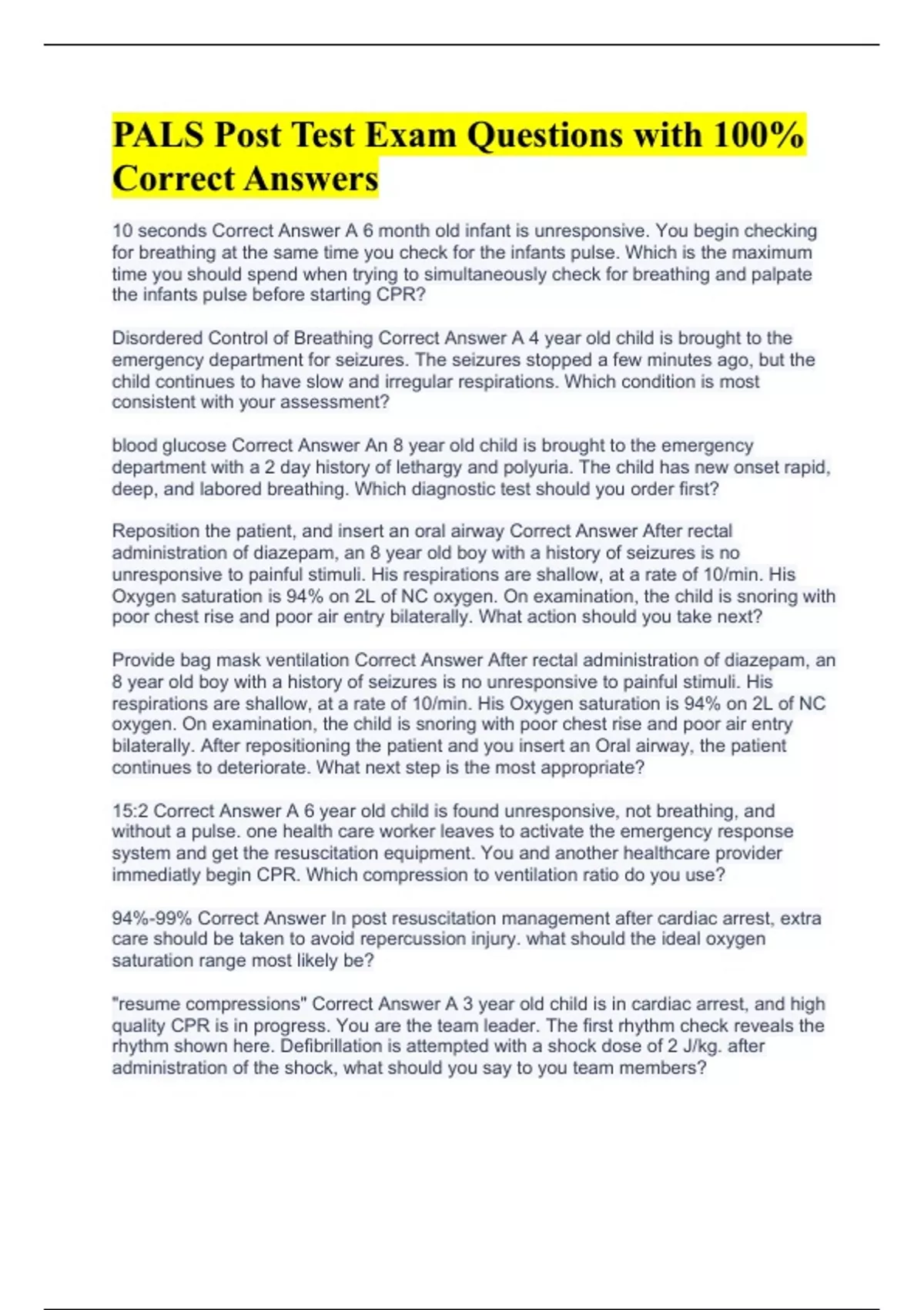 PALS Post Test Exam Questions with 100% Correct Answers