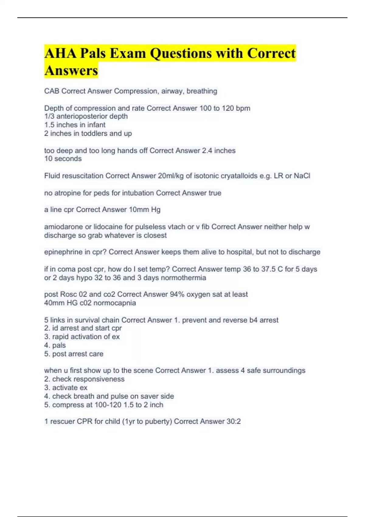 CAB Correct Answer Compression, airway, breathing Depth of compression and rate Correct Answer 100 to 120 bpm 1/3 anterioposterior depth 1.5 inches in infant 2 inches in toddlers and up too deep and too long hands off Correct Answer 2.4 inches 10 seconds Fluid resuscitation Correct Answer 20ml/kg of isotonic cryatalloids e.g. LR or NaCl no atropine for peds for intubation Correct Answer true a line cpr Correct Answer 10mm Hg amiodarone or lidocaine for pulseless vtach or v fib Correct Answer neither help w discharge so grab whatever is closest epinephrine in cpr? Correct Answer keeps them alive to hospital, but not to discharge if in coma post cpr, how do I set temp? Correct Answer temp 36 to 37.5 C for 5 days or 2 days hypo 32 to 36 and 3 days normothermia post Rosc 02 and co2 Correct Answer 94% oxygen sat at least 40mm HG c02 normocapnia 5 links in survival chain Correct Answer 1. prevent and reverse b4 arrest 2. id arrest and start cpr 3. rapid activation of ex