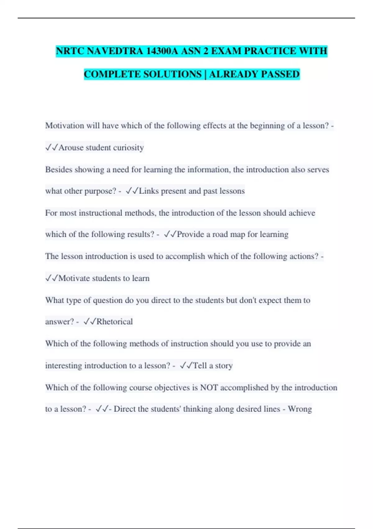 Motivation will have which of the following effects at the beginning of a lesson? - Arouse student curiosity Besides showing a need for learning the information, the introduction also serves what other purpose? - Links present and past lessons For most instructional methods, the introduction of the lesson should achieve which of the following results? - Provide a road map for learning The lesson introduction is used to accomplish which of the following actions? - Motivate students to learn What type of question do you direct to the students but don't expect them to answer? - Rhetorical