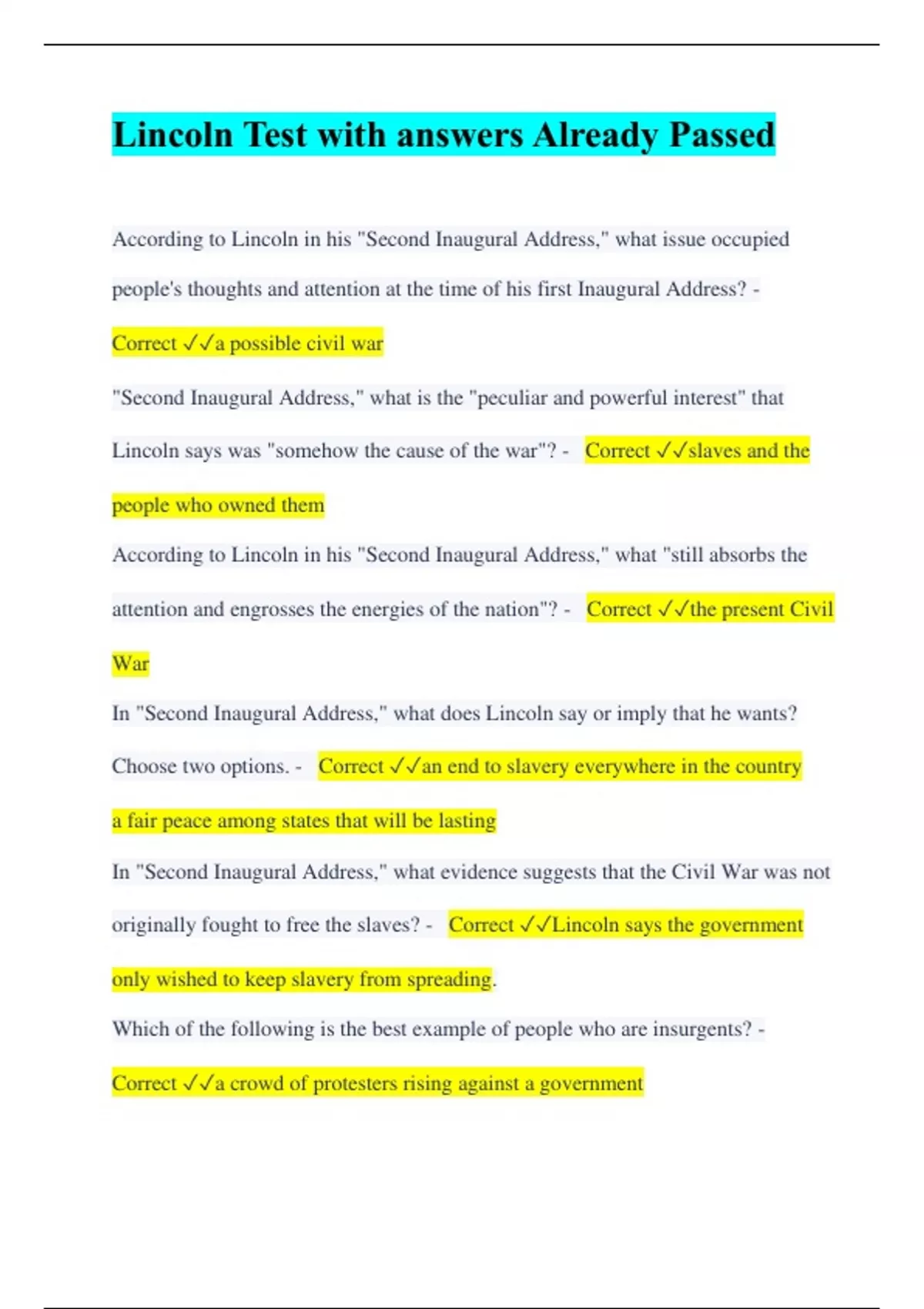 lincoln test with answers already passed
