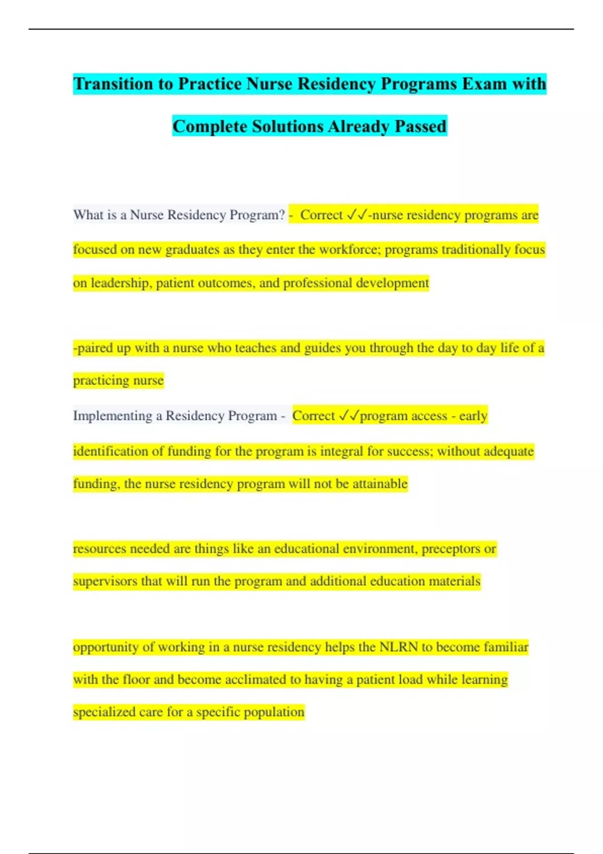 Transition to Practice Nurse Residency Programs Exam with Complete Solutions Already Passed