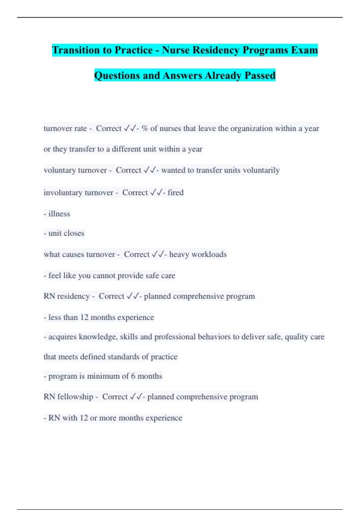 Transition to Practice - Nurse Residency Programs Exam Questions and Answers Already Passed