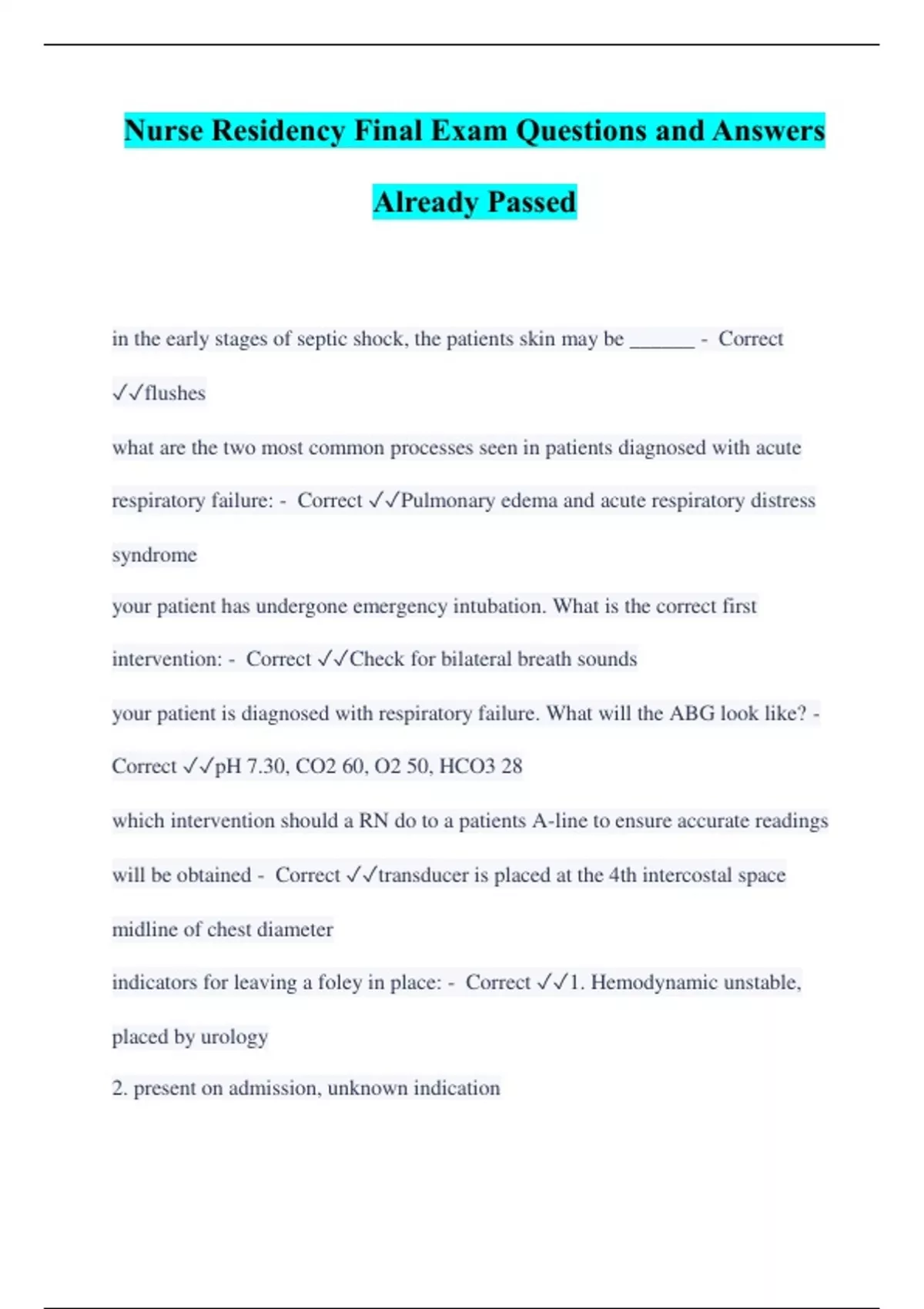 Nurse Residency Final Exam Questions and Answers Already Passed