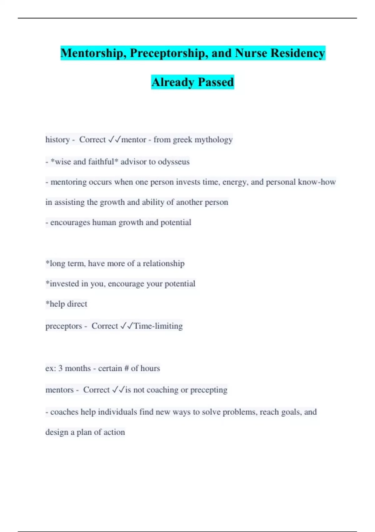 history - Correct mentor - from greek mythology - *wise and faithful* advisor to odysseus - mentoring occurs when one person invests time, energy, and personal know-how in assisting the growth and ability of another person - encourages human growth and potential *long term, have more of a relationship *invested in you, encourage your potential *help direct preceptors - Correct Time-limiting ex: 3 months - certain # of hours