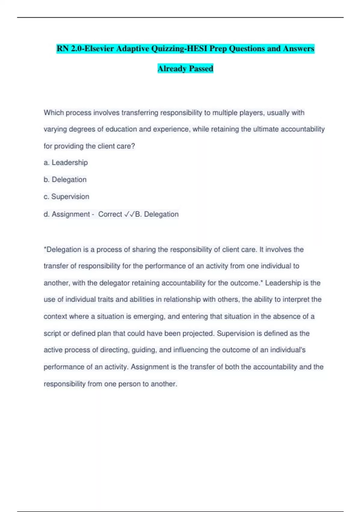 Which process involves transferring responsibility to multiple players, usually with varying degrees of education and experience, while retaining the ultimate accountability for providing the client care? a. Leadership b. Delegation c. Supervision d. Assignment - Correct B. Delegation *Delegation is a process of sharing the responsibility of client care. It involves the transfer of responsibility for the performance of an activity from one individual to another, with the delegator retaining accountability for the outcome.* Leadership is the use of individual traits and abilities in relationship with others, the ability to interpret the context where a situation is emerging, and entering that situation in the absence of a script or defined plan that could have been projected. Supervision is defined as the active process of directing, guiding, and influencing the outcome of an individual's performance of an activity. Assignment is the transfer of both the accountability and the responsibility from one person to another.