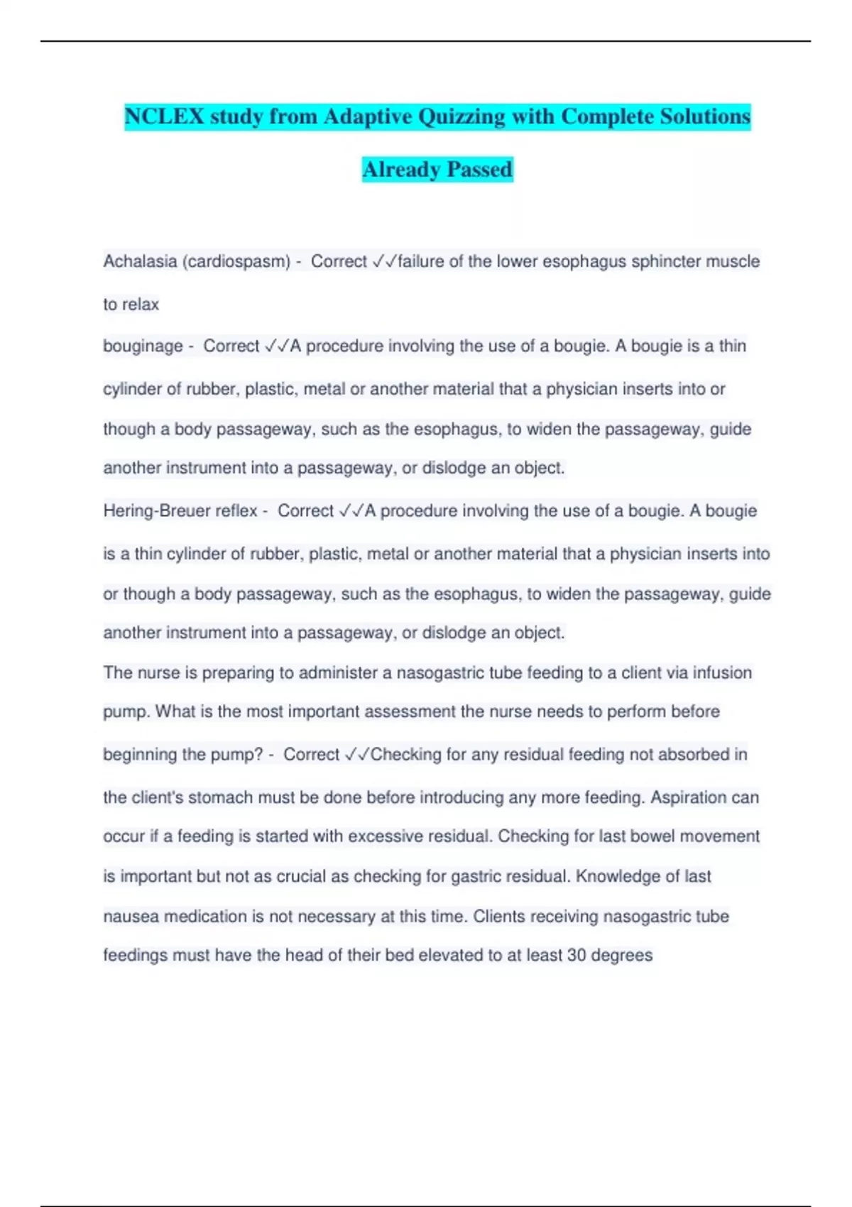 Achalasia (cardiospasm) - Correct failure of the lower esophagus sphincter muscle to relax bouginage - Correct A procedure involving the use of a bougie. A bougie is a thin cylinder of rubber, plastic, metal or another material that a physician inserts into or though a body passageway, such as the esophagus, to widen the passageway, guide another instrument into a passageway, or dislodge an object. Hering-Breuer reflex - Correct A procedure involving the use of a bougie. A bougie is a thin cylinder of rubber, plastic, metal or another material that a physician inserts into or though a body passageway, such as the esophagus, to widen the passageway, guide another instrument into a passageway, or dislodge an object. The nurse is preparing to administer a nasogastric tube feeding to a client via infusion pump. What is the most important assessment the nurse needs to perform before beginning the pump? - Correct Checking for any residual feeding not absorbed in the client's stomach must be done before introducing any more feeding. Aspiration can occur if a feeding is started with excessive residual. Checking for last bowel movement is important but not as crucial as checking for gastric residual. Knowledge of last nausea medication is not necessary at this time. Clients receiving nasogastric tube feedings must have the head of their bed elevated to at least 30 degrees