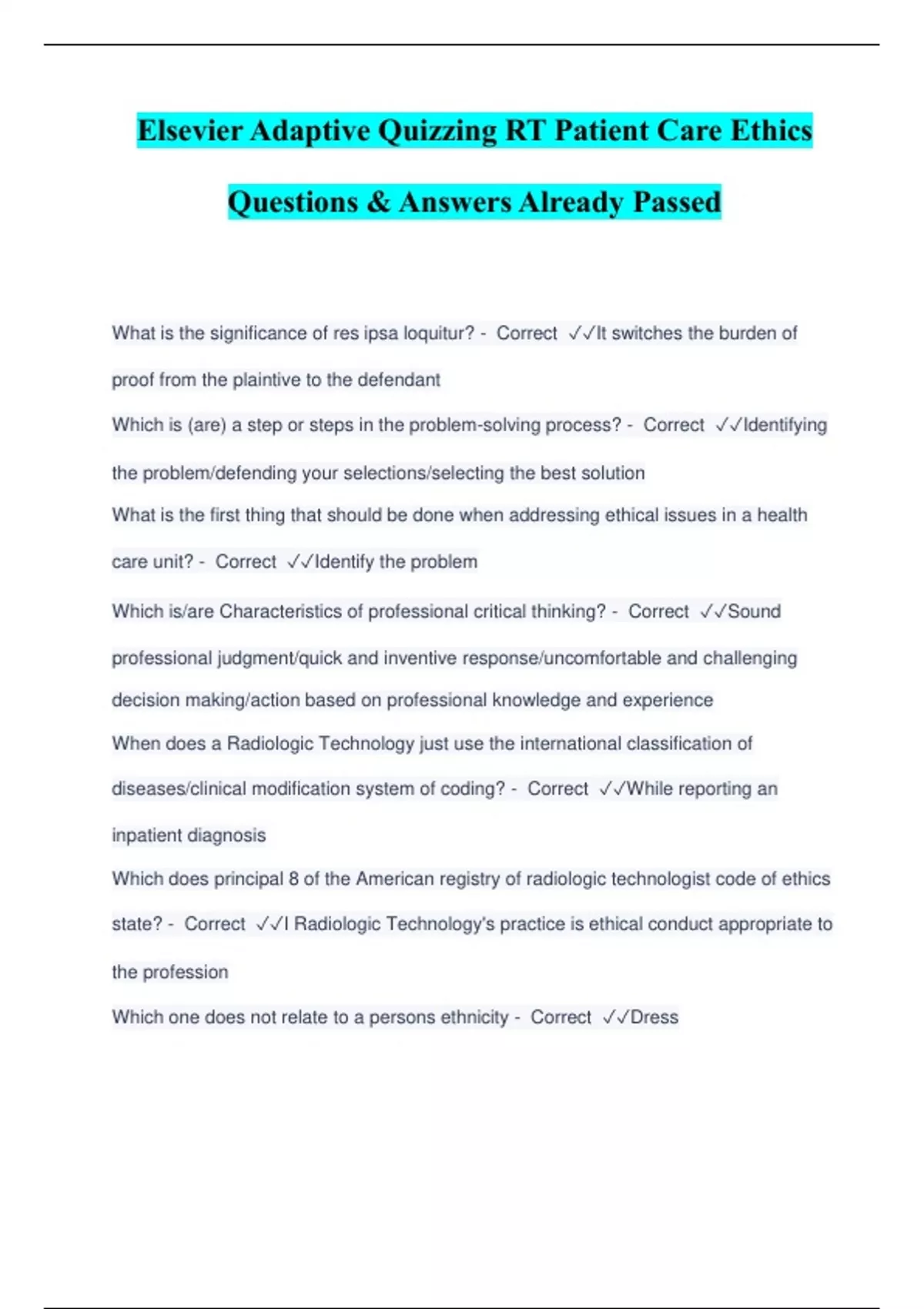 Elsevier Adaptive Quizzing RT Patient Care Ethics Questions & Answers Already Passed