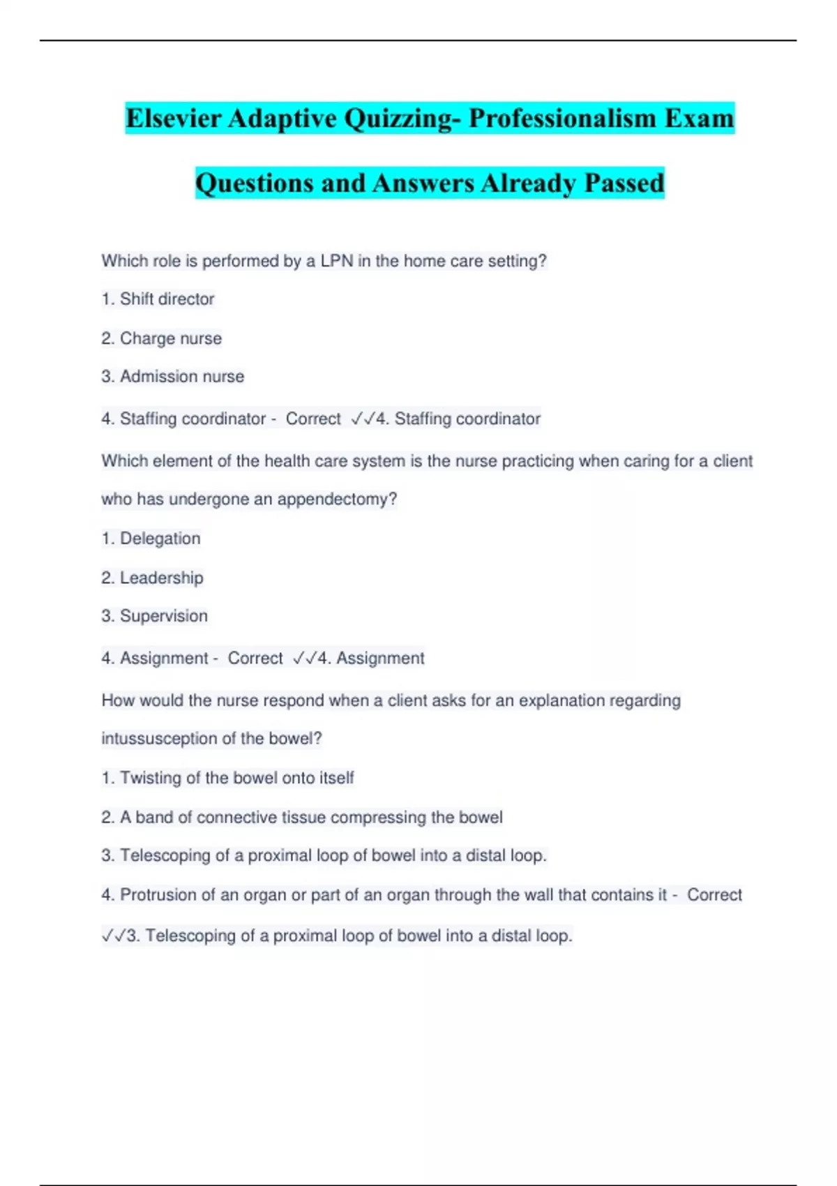 Elsevier Adaptive Quizzing- Professionalism Exam Questions and Answers Already Passed