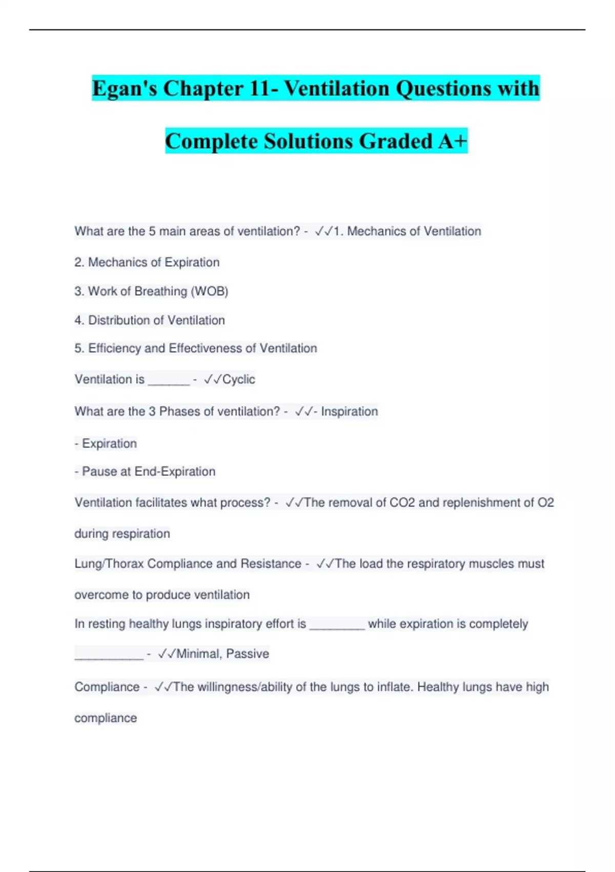 Egan's Chapter 11- Ventilation Questions with Complete Solutions Graded A+