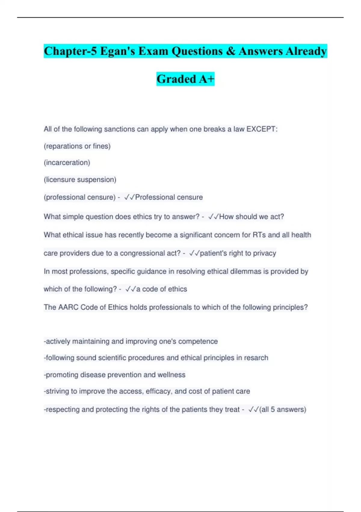 All of the following sanctions can apply when one breaks a law EXCEPT: (reparations or fines) (incarceration) (licensure suspension) (professional censure) - Professional censure What simple question does ethics try to answer? - How should we act? What ethical issue has recently become a significant concern for RTs and all health care providers due to a congressional act? - patient's right to privacy In most professions, specific guidance in resolving ethical dilemmas is provided by which of the following? - a code of ethics The AARC Code of Ethics holds professionals to which of the following principles? -actively maintaining and improving one's competence -following sound scientific procedures and ethical principles in resarch -promoting disease prevention and wellness -striving to improve the access, efficacy, and cost of patient care -respecting and protecting the rights of the patients they treat - (all 5 answers)
