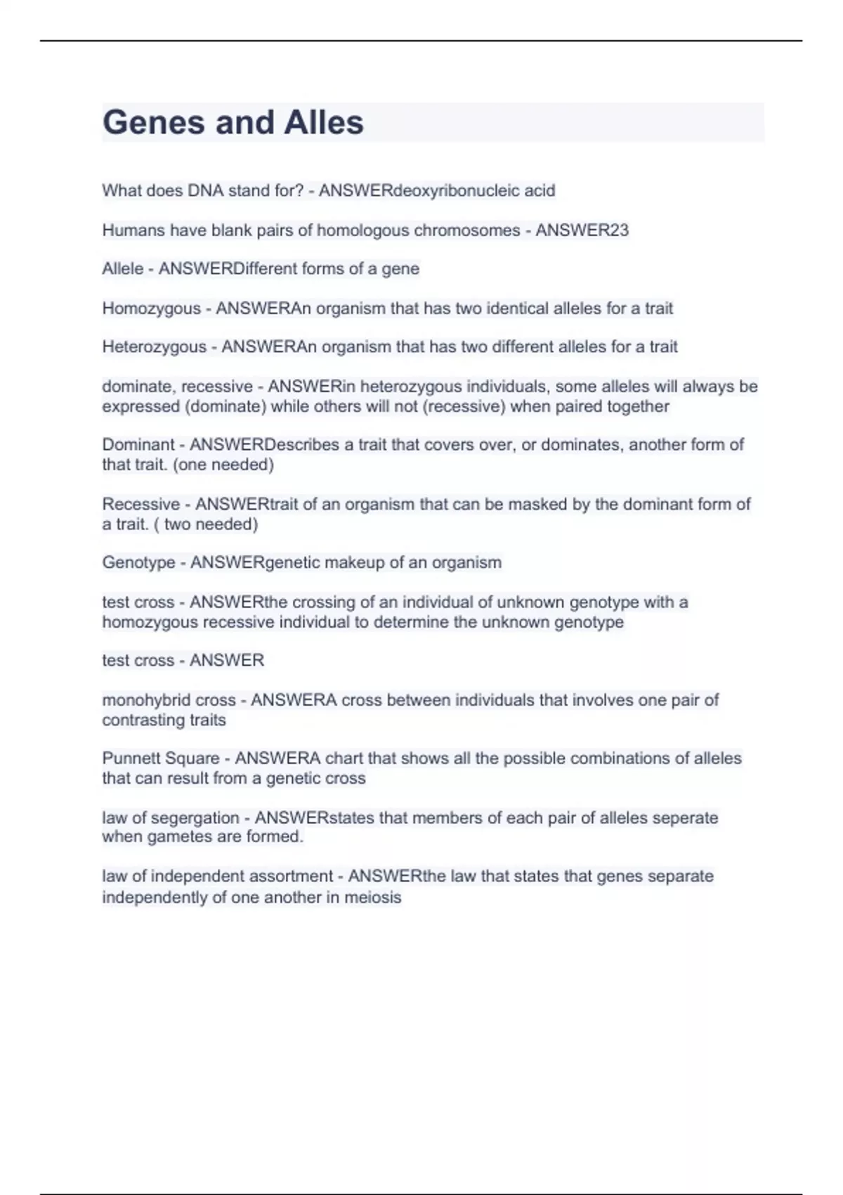 Genes and Alles.Questions with correct answers