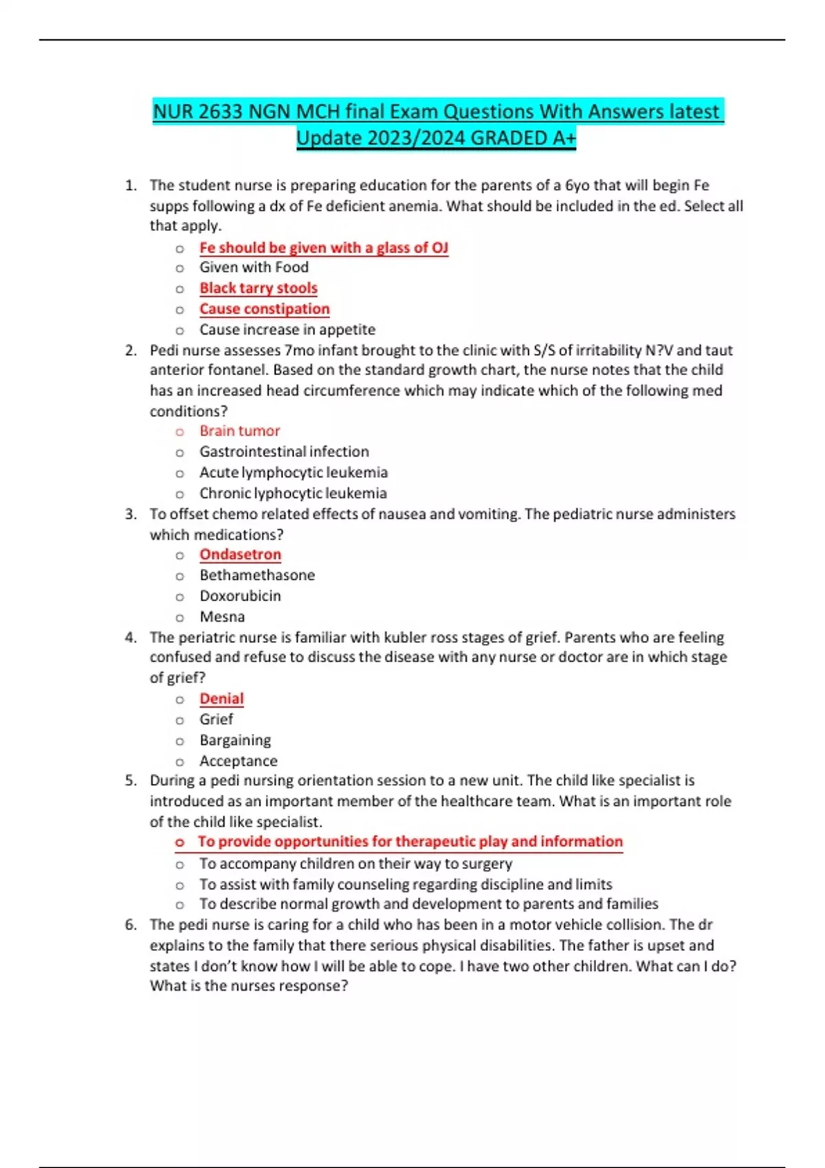 NUR 2633 NGN MCH final Exam Questions With Answers latest Update 2023/2024 GRADED A+ 1.The student nurse is preparing education for the parents of a 6yo that will begin Fe supps following a dx of Fe deficient anemia. What should be included in the ed. Select all that apply. oFe should be given with a glass of OJ oGiven with Food oBlack tarry stools oCause constipation oCause increase in appetite 2.Pedi nurse assesses 7mo infant brought to the clinic with S/S of irritability N?V and taut anterior fontanel. Based on the standard growth chart, the nurse notes that the child has an increased head circumference which may indicate which of the following med conditions? oBrain tumor oGastrointestinal infection oAcute lymphocytic leukemia oChronic lyphocytic leukemia 3.To offset chemo related effects of nausea and vomiting. The pediatric nurse administers which medications? oOndasetron oBethamethasone oDoxorubicin oMesna 4.The periatric nurse is familiar with kubler ross stages of grief. Parents who are feeling confused and refuse to discuss the disease with any nurse or doctor are in which stage of grief? oDenial oGrief oBargaining oAcceptance 5.During a pedi nursing orientation session to a new unit. The child like specialist is introduced as an important member of the healthcare team. What is an important role of the child like specialist. o To provide opportunities for therapeutic play and information oTo accompany children on their way to surgery oTo assist with family counseling regarding discipline and limits oTo describe normal growth and development to parents and families 6.The pedi nurse is caring for a child who has been in a motor vehicle collision. The dr explains to the family that there serious physical disabilities. The father is upset and states I don’t know how I will be able to cope. I have two other children. What can I do? What is the nurses response? oYou obviously were not listening to the dr. he can explain it to you again Don’t worry. You will be able to
