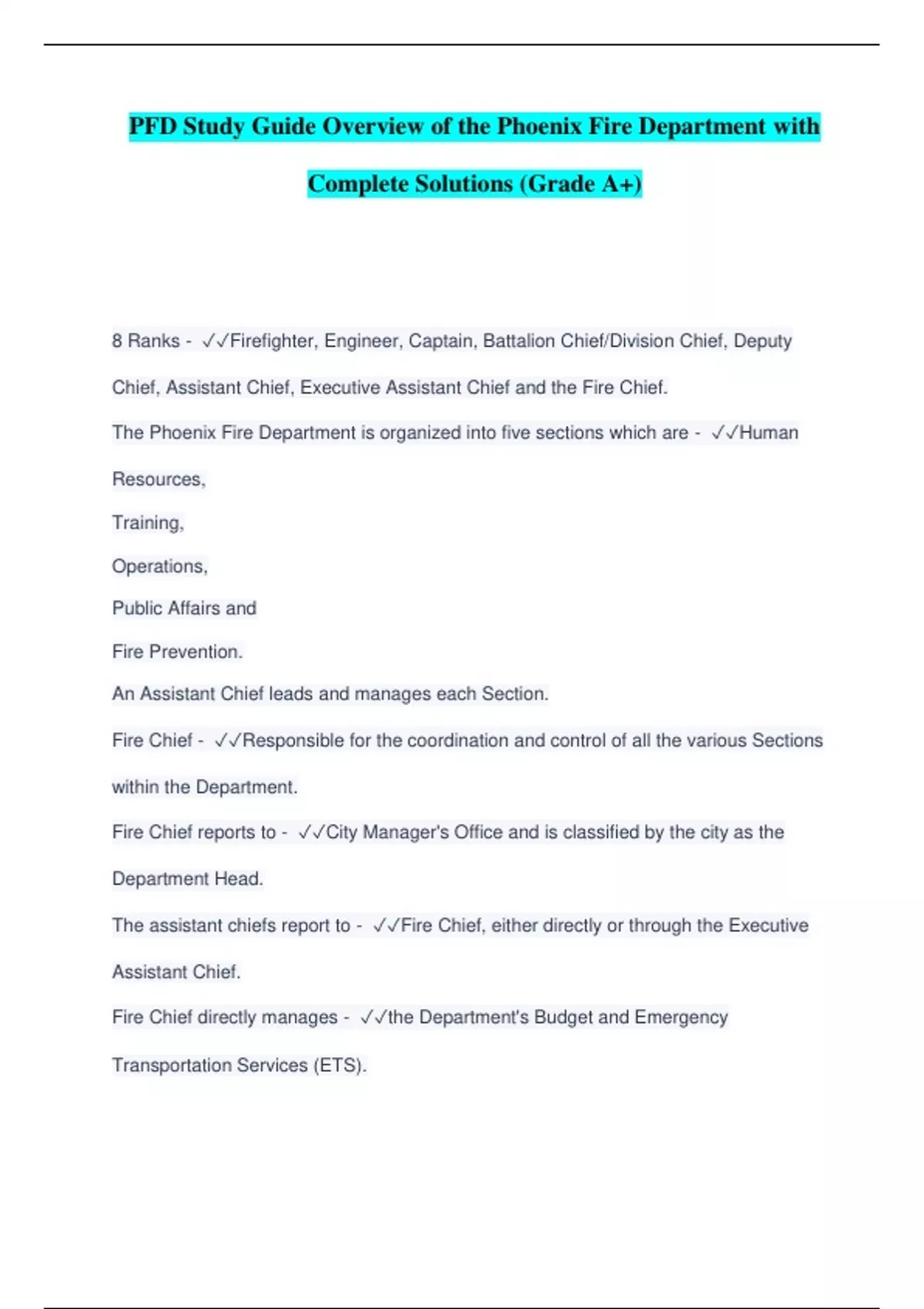 PFD Study Guide Overview of the Phoenix Fire Department with Complete Solutions (Grade A+)