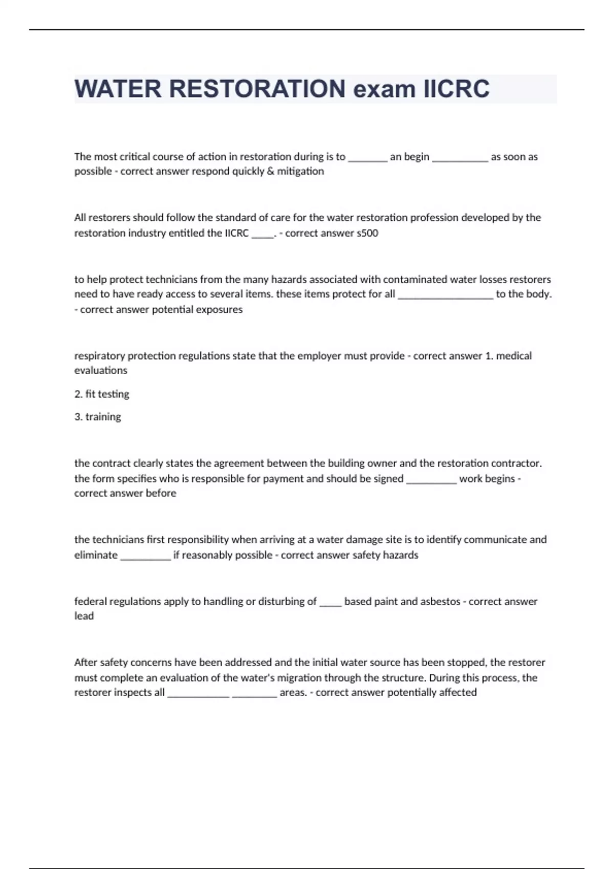 WATER RESTORATION exam IICRC The most critical course of action in restoration during is to _______ an begin __________ as soon as possible - correct answer respond quickly & mitigation All restorers should follow the standard of care for the water restoration profession developed by the restoration industry entitled the IICRC ____. - correct answer s500 to help protect technicians from the many hazards associated with contaminated water losses restorers need to have ready access to several items. these items protect for all _________________ to the body. - correct answer potential exposures respiratory protection regulations state that the employer must provide - correct answer 1. medical evaluations 2. fit testing 3. training the contract clearly states the agreement between the building owner and the restoration contractor. the form specifies who is responsible for payment and should be signed _________ work begins - correct answer before the technicians first responsibility when arriving at a water damage site is to identify communicate and eliminate _________ if reasonably possible - correct answer safety hazards federal regulations apply to handling or disturbing of ____ based paint and asbestos - correct answer lead After safety concerns have been addressed and the initial water source has been stopped, the restorer must complete an evaluation of the water's migration through the structure. During this process, the restorer inspects all ___________ ________ areas. - correct answer potentially affected