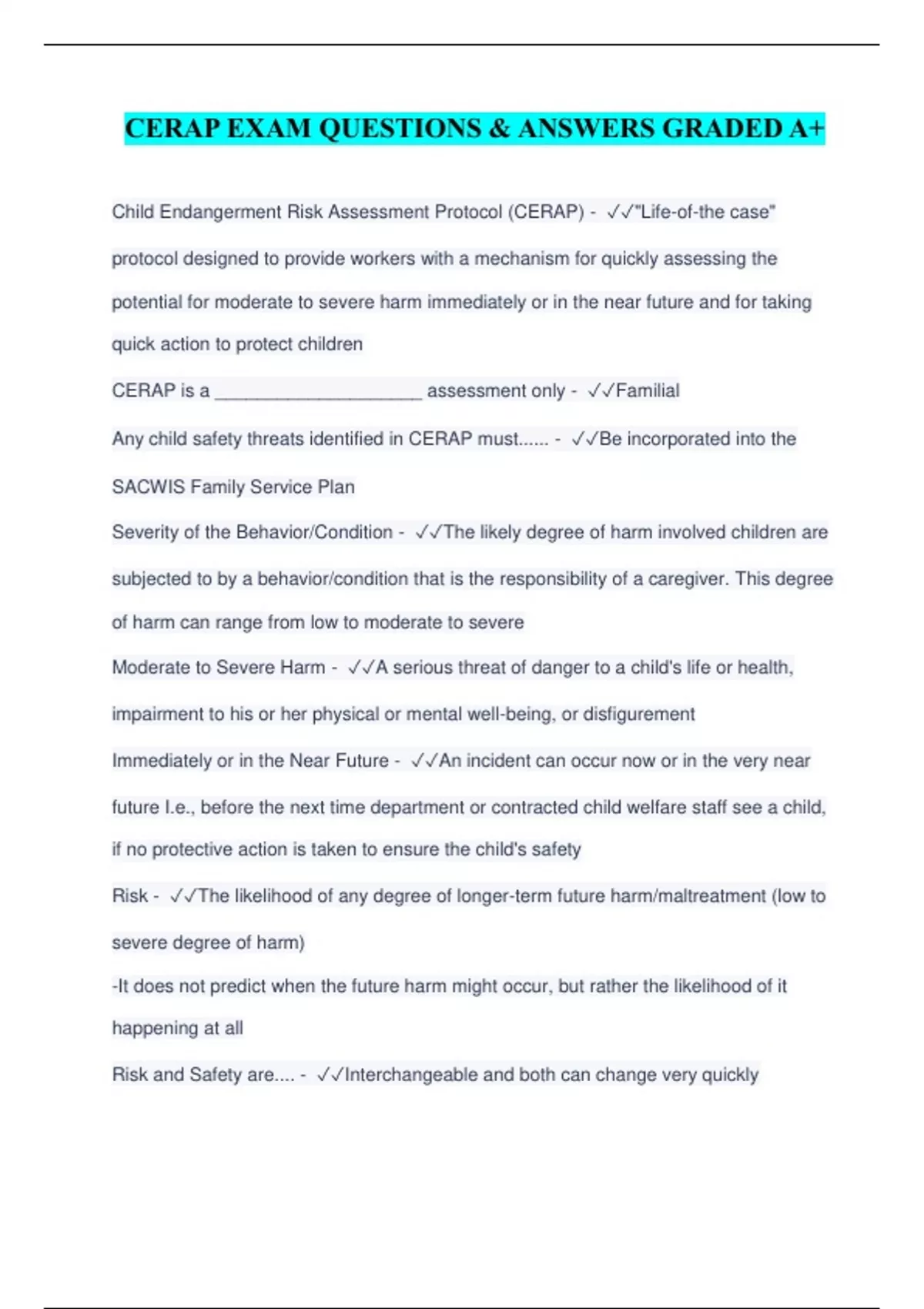 Child Endangerment Risk Assessment Protocol (CERAP) - "Life-of-the case" protocol designed to provide workers with a mechanism for quickly assessing the potential for moderate to severe harm immediately or in the near future and for taking quick action to protect children CERAP is a ____________________ assessment only - Familial Any child safety threats identified in CERAP must...... - Be incorporated into the SACWIS Family Service Plan Severity of the Behavior/Condition - The likely degree of harm involved children are subjected to by a behavior/condition that is the responsibility of a caregiver. This degree of harm can range from low to moderate to severe Moderate to Severe Harm - A serious threat of danger to a child's life or health, impairment to his or her physical or mental well-being, or disfigurement Immediately or in the Near Future - An incident can occur now or in the very near future I.e., before the next time department or contracted child welfare staff see a child, if no protective action is taken to ensure the child's safety Risk - The likelihood of any degree of longer-term future harm/maltreatment (low to severe degree of harm)