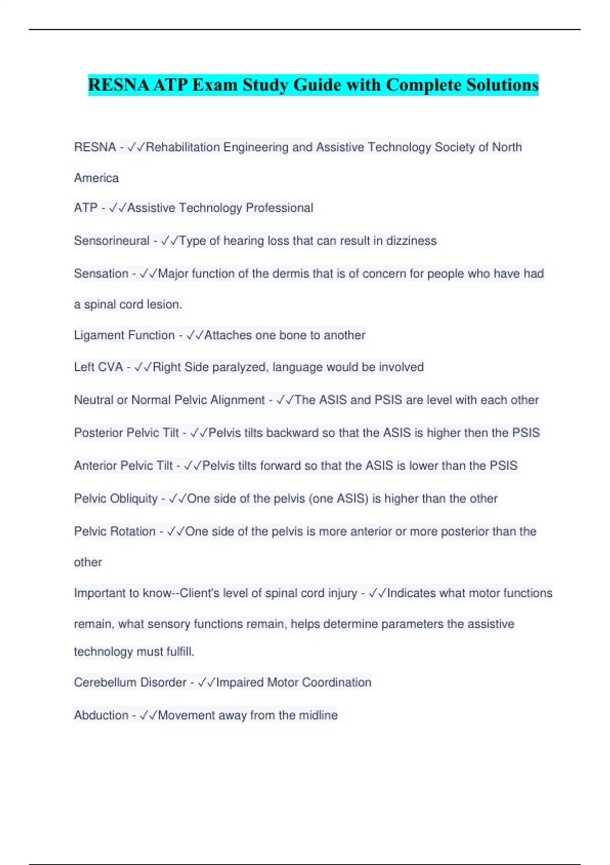 RESNA - Rehabilitation Engineering and Assistive Technology Society of North America ATP - Assistive Technology Professional Sensorineural - Type of hearing loss that can result in dizziness Sensation - Major function of the dermis that is of concern for people who have had a spinal cord lesion. Ligament Function - Attaches one bone to another Left CVA - Right Side paralyzed, language would be involved Neutral or Normal Pelvic Alignment - The ASIS and PSIS are level with each other Posterior Pelvic Tilt - Pelvis tilts backward so that the ASIS is higher then the PSIS Anterior Pelvic Tilt - Pelvis tilts forward so that the ASIS is lower than the PSIS Pelvic Obliquity - One side of the pelvis (one ASIS) is higher than the other Pelvic Rotation - One side of the pelvis is more anterior or more posterior than the other