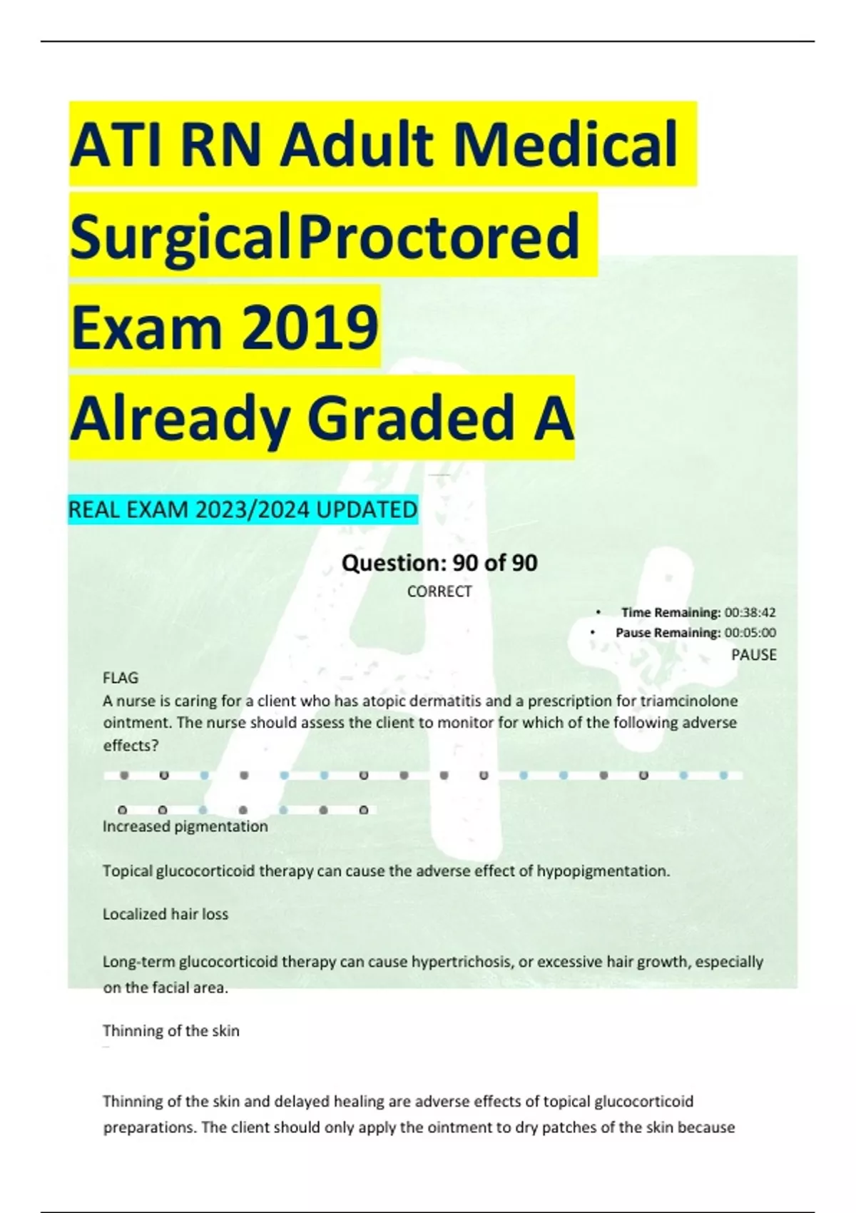 ATI RN Adult Medical SurgicalProctored Exam 2019 Already Graded A Que stion 90 loade d ra tionals pr ovide d REAL EXAM 2023/2024 UPDATED FLAG Question: 90 of 90 CORRECT • Time Remaining: 00:38:42 • Pause Remaining: 00:05:00 PAUSE A nurse is caring for a client who has atopic dermatitis and a prescription for triamcinolone ointment. The nurse should assess the client to monitor for which of the following adverse effects? Increased pigmentation Topical glucocorticoid therapy can cause the adverse effect of hypopigmentation. Localized hair loss