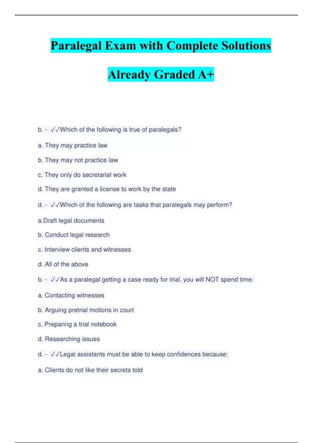 b. - Which of the following is true of paralegals? a. They may practice law b. They may not practice law c. They only do secretarial work d. They are granted a license to work by the state d. - Which of the following are tasks that paralegals may perform? a.Draft legal documents b. Conduct legal research c. Interview clients and witnesses d. All of the above b. - As a paralegal getting a case ready for trial, you will NOT spend time: a. Contacting witnesses b. Arguing pretrial motions in court c. Preparing a trial notebook d. Researching issues d. - Legal assistants must be able to keep confidences because: