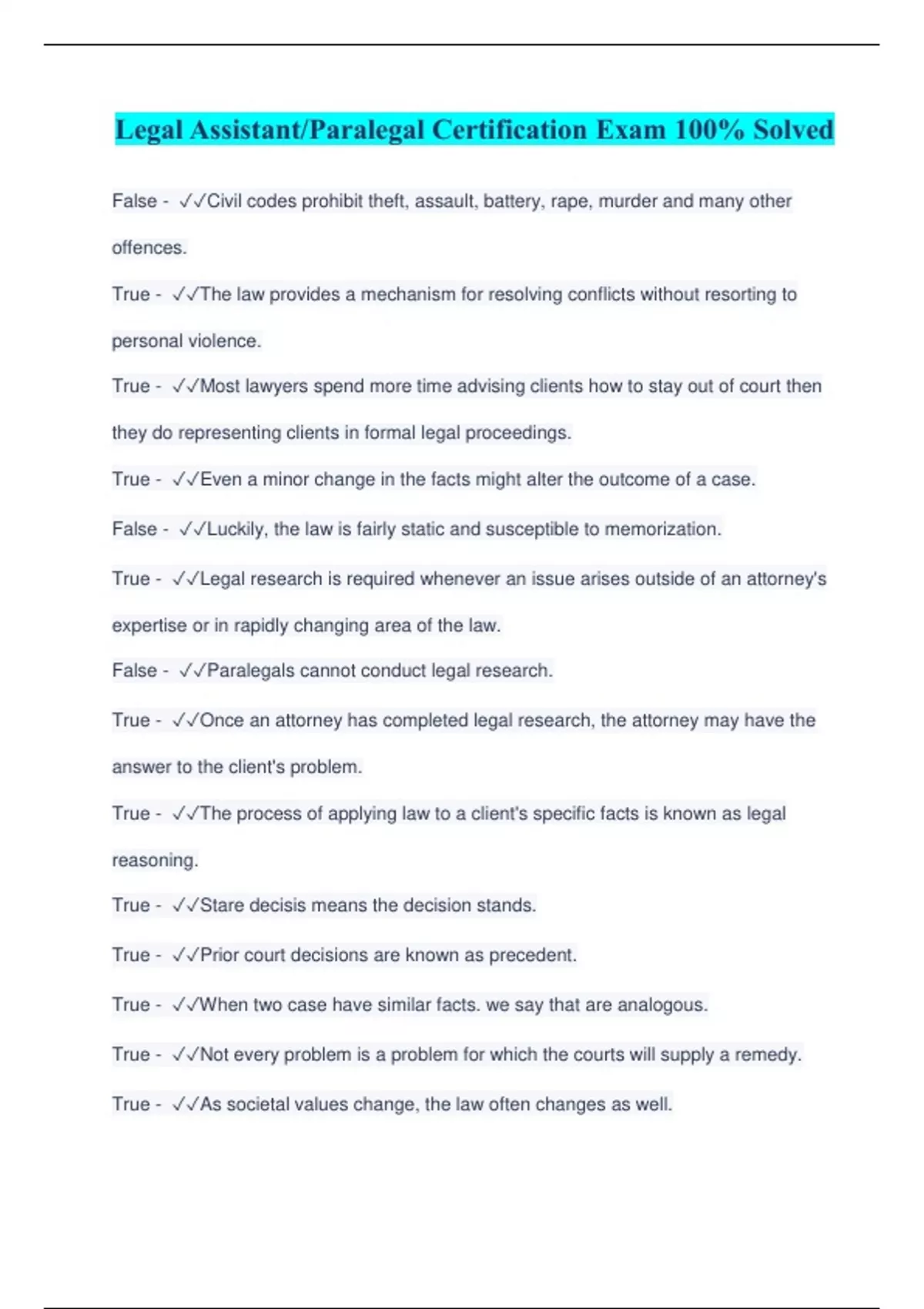 False - Civil codes prohibit theft, assault, battery, rape, murder and many other offences. True - The law provides a mechanism for resolving conflicts without resorting to personal violence. True - Most lawyers spend more time advising clients how to stay out of court then they do representing clients in formal legal proceedings. True - Even a minor change in the facts might alter the outcome of a case. False - Luckily, the law is fairly static and susceptible to memorization. True - Legal research is required whenever an issue arises outside of an attorney's expertise or in rapidly changing area of the law. False - Paralegals cannot conduct legal research. True - Once an attorney has completed legal research, the attorney may have the answer to the client's problem. True - The process of applying law to a client's specific facts is known as legal reasoning.
