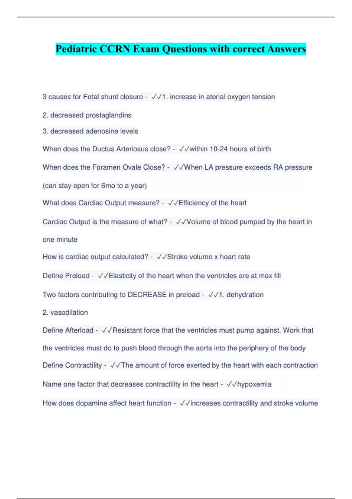 3 causes for Fetal shunt closure - 1. increase in aterial oxygen tension 2. decreased prostaglandins 3. decreased adenosine levels When does the Ductus Arteriosus close? - within 10-24 hours of birth When does the Foramen Ovale Close? - When LA pressure exceeds RA pressure (can stay open for 6mo to a year) What does Cardiac Output measure? - Efficiency of the heart Cardiac Output is the measure of what? - Volume of blood pumped by the heart in one minute How is cardiac output calculated? - Stroke volume x heart rate Define Preload - Elasticity of the heart when the ventricles are at max fill Two factors contributing to DECREASE in preload - 1. dehydration 2. vasodilation Define Afterload