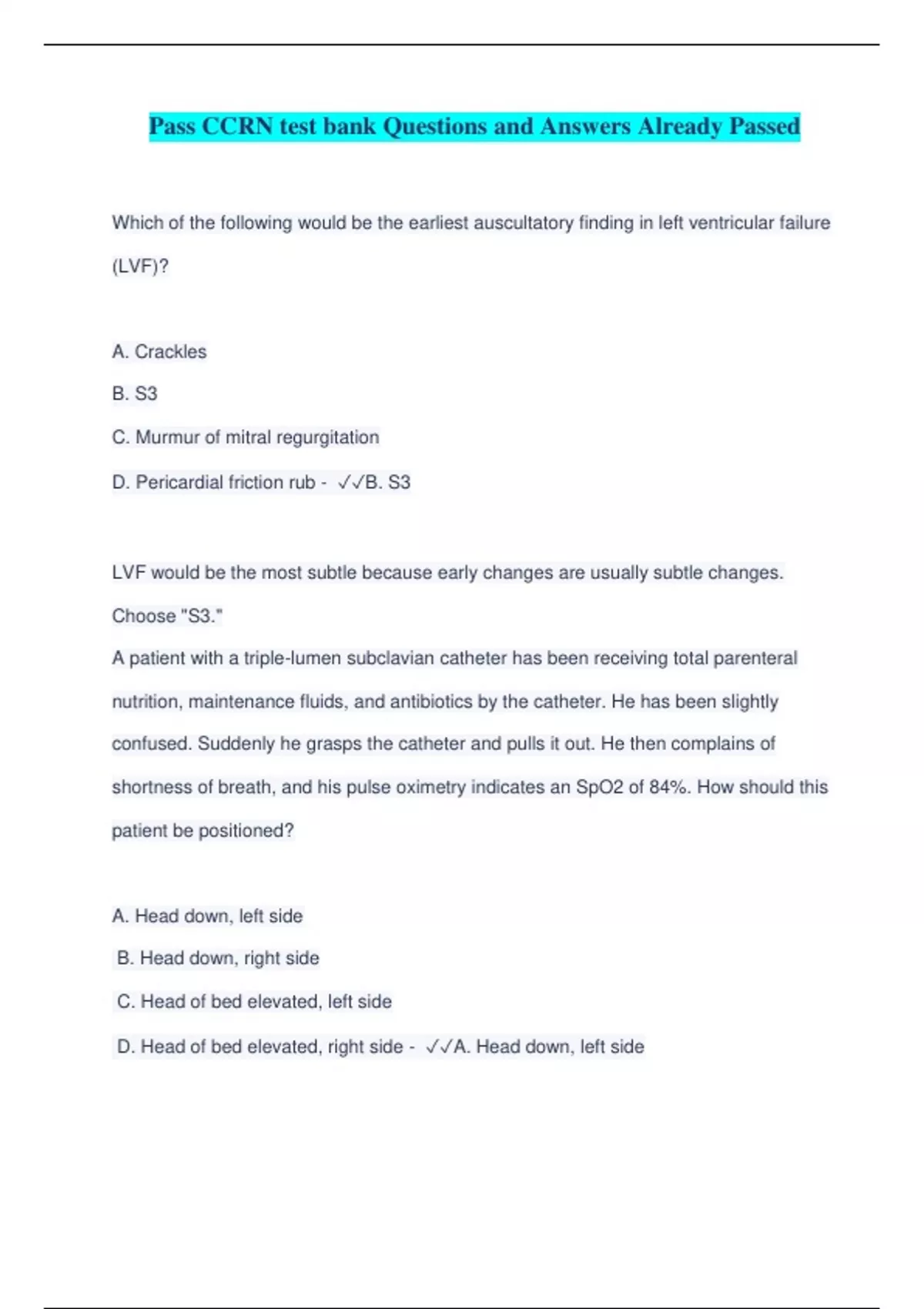 Which of the following would be the earliest auscultatory finding in left ventricular failure (LVF)? A. Crackles B. S3 C. Murmur of mitral regurgitation D. Pericardial friction rub - B. S3 LVF would be the most subtle because early changes are usually subtle changes. Choose "S3." A patient with a triple-lumen subclavian catheter has been receiving total parenteral nutrition, maintenance fluids, and antibiotics by the catheter. He has been slightly confused. Suddenly he grasps the catheter and pulls it out. He then complains of shortness of breath, and his pulse oximetry indicates an SpO2 of 84%. How should this patient be positioned? A. Head down, left side B. Head down, right side C. Head of bed elevated, left side D. Head of bed elevated, right side - A. Head down, left side