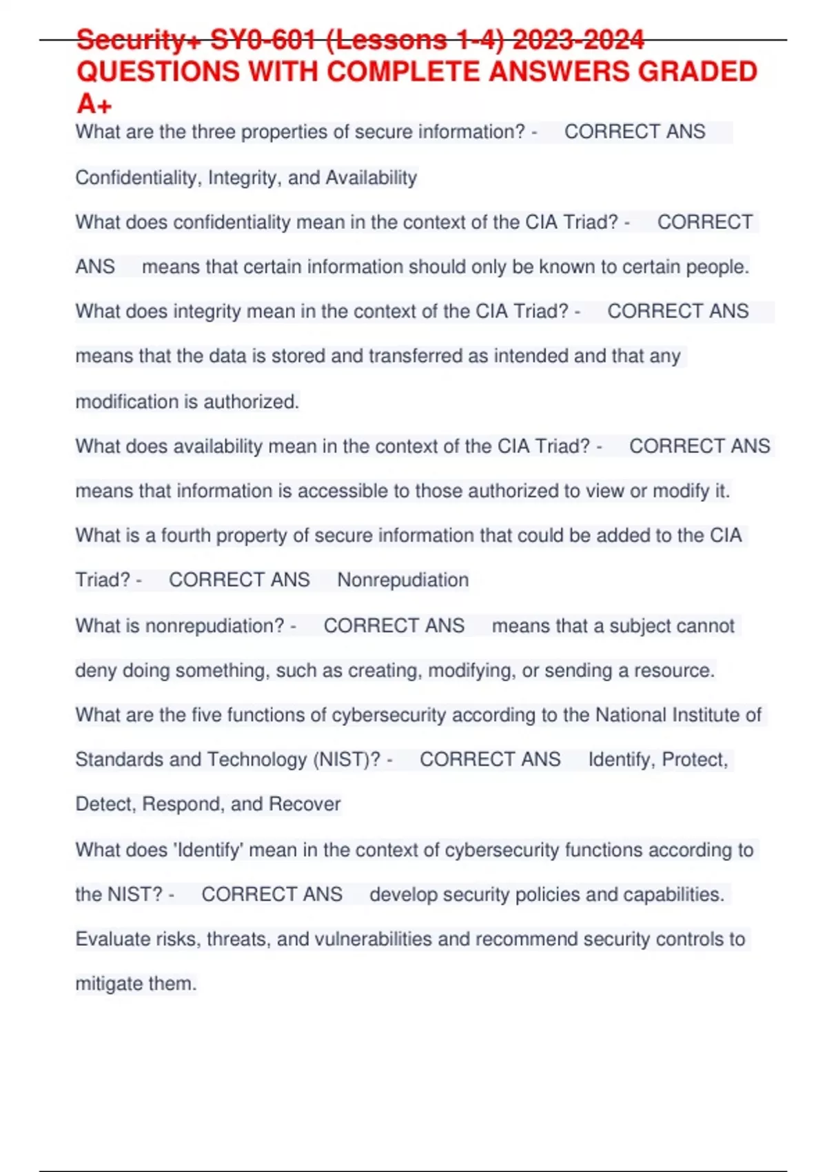 Security+ SY0-601 (Lessons 1-4) QUESTIONS WITH COMPLETE ANSWERS GRADED A+
