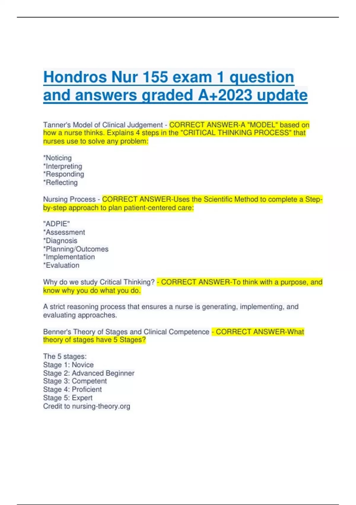 Hondros Nur 155 exam 1 question and answers graded A+2023 update Tanner's Model of Clinical Judgement - CORRECT ANSWER-A "MODEL" based on how a nurse thinks. Explains 4 steps in the "CRITICAL THINKING PROCESS" that nurses use to solve any problem: *Noticing *Interpreting *Responding *Reflecting Nursing Process - CORRECT ANSWER-Uses the Scientific Method to complete a Stepby-step approach to plan patient-centered care: "ADPIE" *Assessment *Diagnosis *Planning/Outcomes *Implementation *Evaluation Why do we study Critical Thinking? - CORRECT ANSWER-To think with a purpose, an