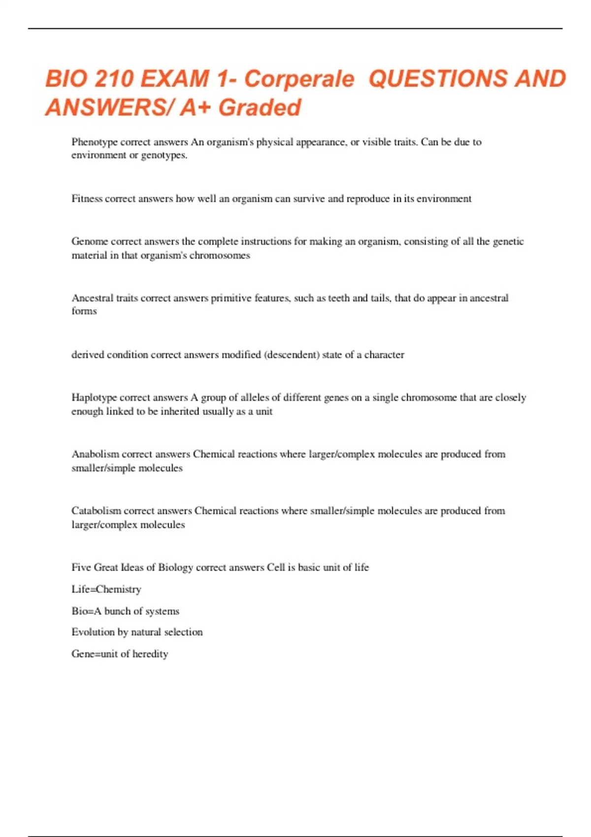 bio 210 exam 1 corperale questions and answers a