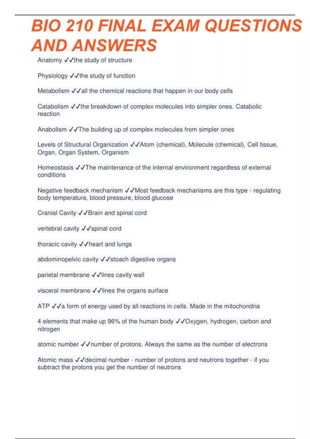 BIO 210 - FINAL EXAM REVIEW Questions with complete solution