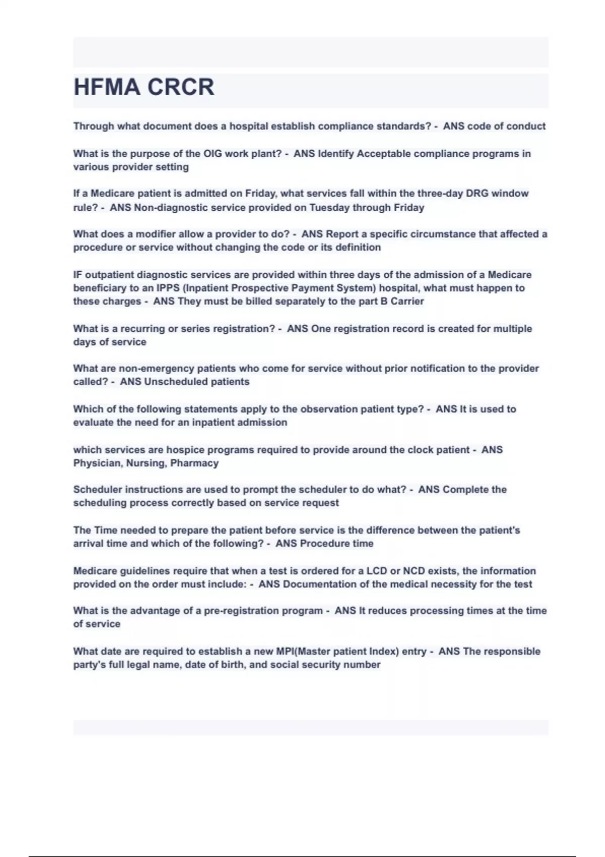 HFMA CRCR Actual Exam Questions with correct Answers Latest Version 2024( A GRADED 100% VERIFIED)!! ALL BUNDLED HERE!!!.