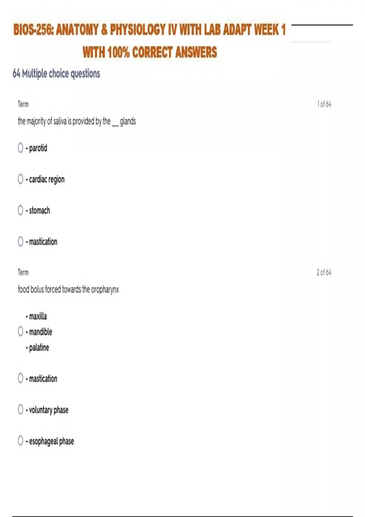 BIOS-256: ANATOMY & PHYSIOLOGY IV WITH LAB ADAPT WEEK 1 WITH 100% CORRECT ANSWERS