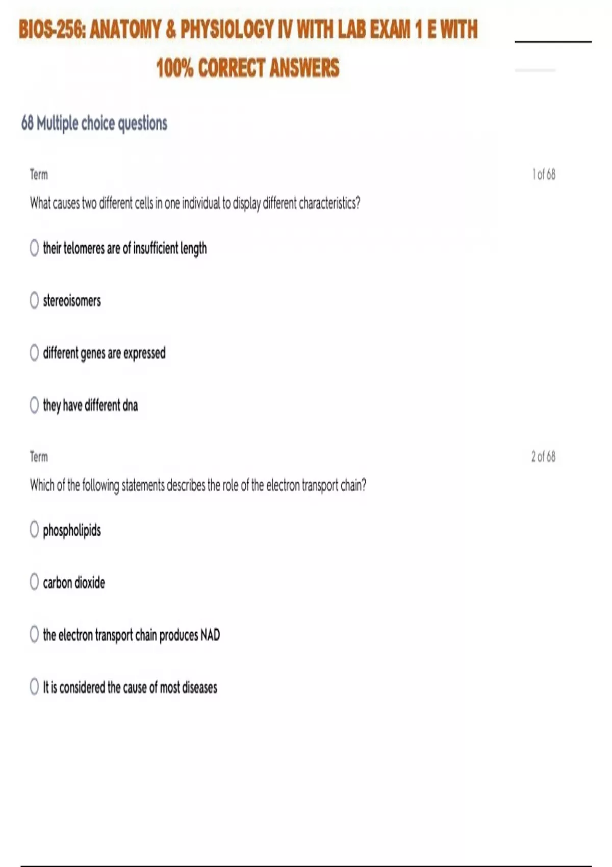 BIOS-256: ANATOMY & PHYSIOLOGY IV WITH LAB EXAM 1 E WITH 100% CORRECT ANSWERS