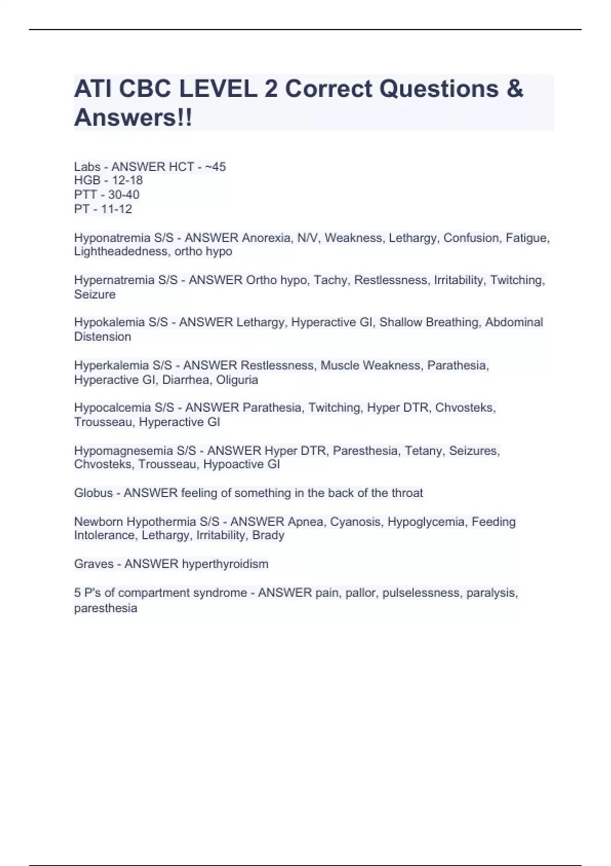 Labs - ANSWER HCT - ~45 HGB - 12-18 PTT - 30-40 PT - 11-12 Hyponatremia S/S - ANSWER Anorexia, N/V, Weakness, Lethargy, Confusion, Fatigue, Lightheadedness, ortho hypo Hypernatremia S/S - ANSWER Ortho hypo, Tachy, Restlessness, Irritability, Twitching, Seizure Hypokalemia S/S - ANSWER Lethargy, Hyperactive GI, Shallow Breathing, Abdominal Distension Hyperkalemia S/S - ANSWER Restlessness, Muscle Weakness, Parathesia, Hyperactive GI, Diarrhea, Oliguria