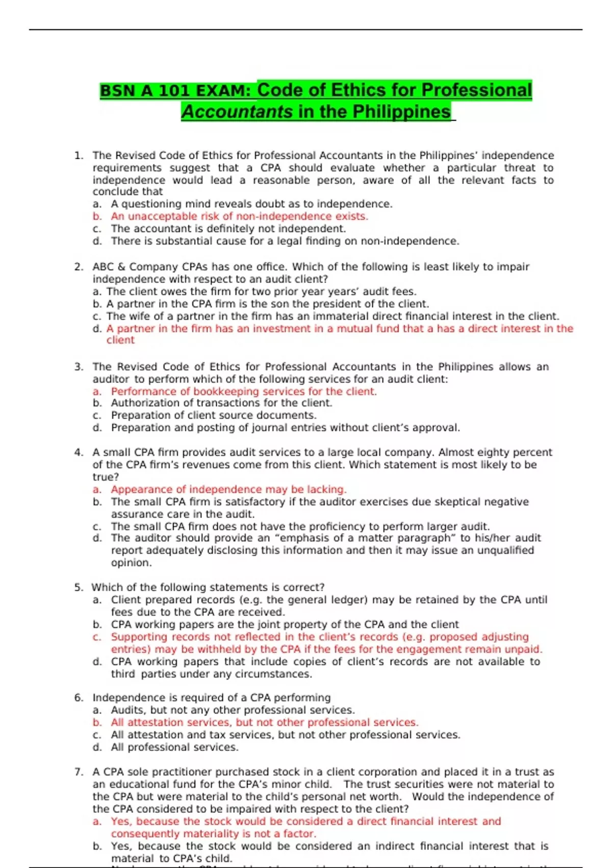 BSN A 101 EXAM: Code of Ethics for Professional Accountants in the Philippines