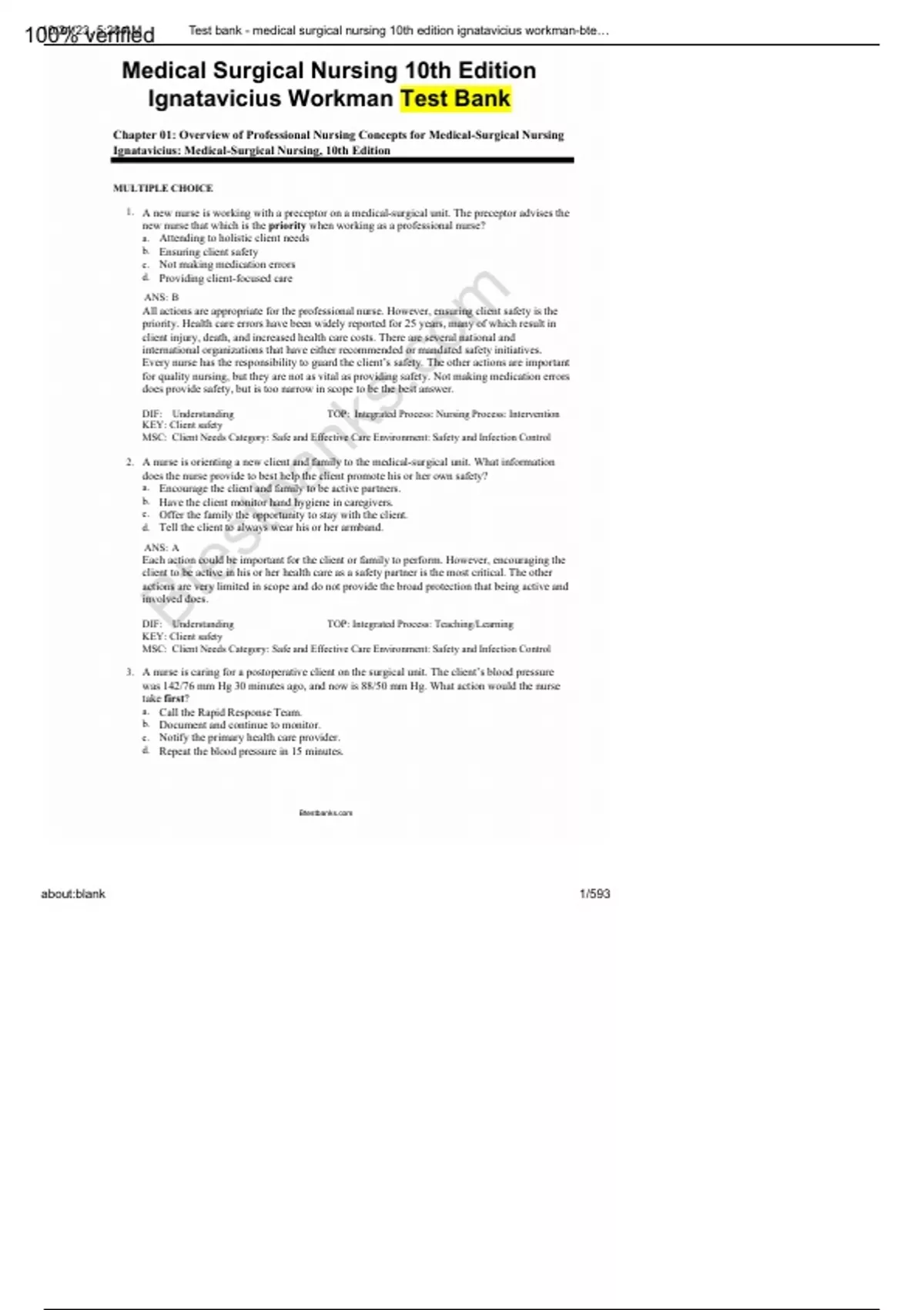 Medical Surgical Nursing 10th Edition Ignatavicius Workman Test Bank Chapter 01: Overview of Professional Nursing Concepts for Medical-Surgical Nursing Ignatavicius: Medical-Surgical Nursing, 10th Edition MULTIPLE CHOICE 1. A new nurse is working with a preceptor on a medical-surgical unit. The preceptor advises the new nurse that which is the priority when working as a professional nurse? a. Attending to holistic client needs b. Ensuring client safety c. Not making medication errors d. Providing client-focused care ANS: B All actions are appropriate for the professional nurse. However, ensuring client safety is the priority. Health care errors have been widely reported for 25 years, many of which result in client injury, death, and increased health care costs. There are several national and international organizations that have either recommended or mandated safety initiatives. Every nurse has the responsibility to guard the client’s safety. The other actions are important for quality nursing, but they are not as vital as providing safety. Not making medication errors does provide safety, but is too narrow in scope to be the best answer. DIF: Understanding TOP: Integrated Process: Nursing Process: Intervention KEY: Client safety MSC: Client Needs Category: Safe and Effective Care Environment: Safety and Infection Control 2. A nurse is orienting a new client and family to the medical-surgical unit. What information does the nurse provide to best help the client promote his or her own safety? a. Encourage the client and family to be active partners. b. Have the client monitor hand hygiene in caregivers. c. Offer the family the opportunity to stay with the client. d. Tell the client to always wear his or her armband. ANS: A Each action could be important for the client or family to perform. However, encouraging the client to be active in his or her health care as a safety partner is the most critical. The other actions are very limited in scope and do not provide the broad protection that being active and involved does. DIF: Understanding TOP: Integrated Process: Teaching/Learning KEY: Client safety MSC: Client Needs Category: Safe and Effective Care Environment: Safety and Infection Control 3. A nurse is caring for a postoperative client on the surgical unit. The client’s blood pressure was 142/76 mm Hg 30 minutes ago, and now is 88/50 mm Hg. What action would the nurse take first? a. Call the Rapid Response Team. b. Document and continue to monitor. c. Notify the primary health care provider. d. Repeat the blood pressure in 15 minutes. B 10/31/23, 5:28 AM Test bank - medical surgical nursing 10th edition ignatavicius workman-bte… about:blank 2/593 ANS: A The purpose of the Rapid Response Team (RRT) is to intervene when clients are deteriorating before they suffer either respiratory or cardiac arrest. Since the client has manifested a significant change, the nurse would call the RRT. Changes in blood pressure, mental status, heart rate, temperature, oxygen saturation, and last 2 hours’ urine output are particularly significant and are part of the Modified Early Warning System guide. Documentation is vital, but the nurse must do more than document. The primary health care provider would be notified, but this is not more important than calling the RRT. The client’s blood pressure would be reassessed frequently, but the priority is getting the rapid care to the client. DIF: Applying TOP: Integrated Process: Communication and Documentation KEY: Rapid Response Team (RRT), Clinical judgment MSC: Client Needs Category: Physiological Integrity: Physiological Adaptation 4. A nurse wishes to provide client-centered care in all interactions. Which action by the nurse best demonstrates this concept? a. Assesses for cultural influences affecting health care. b. Ensures that all the client’s basic needs are met. c. Tells the client and family about all upcoming tests. d. Thoroughly orients the client and family to the room. ANS: A Showing respect for the client and family’s preferences and needs is essential to ensure a holistic or “whole-person” approach to care. By assessing the effect of the client’s culture on health care, this nurse is practicing client-focused care. Providing for basic needs does not demonstrate this competence. Simply telling the client about all upcoming tests is not providing empowering education. Orienting the client and family to the room is an important safety measure, but not directly related to demonstrating client-centered care. DIF: Understanding TOP: Integrated Process: Culture and Spirituality KEY: Client-centered care, Culture MSC: Client Needs Category: Psychosocial Integrity 5. A client is going to be admitted for a scheduled surgical procedure. Which action does the nurse explain is the most important thing the client can do to protect against errors? a. Bring a list of all medications and what they are for. b. Keep the provider’s phone number by the telephone. c. Make sure that all providers wash hands before entering the room. d. Write down the name of each caregiver who comes in the room. ANS: A Medication reconciliation is a formal process in which the client’s actual current medications are compared to the prescribed medications at the time of admission, transfer, or discharge. This National client Safety Goal is important to reduce medication errors. The client would not have to be responsible for providers washing their hands, and even if the client does so, this is too narrow to be the most important action to prevent errors. Keeping the provider’s phone number nearby and documenting everyone who enters the room also do not guarantee safety. DIF: Applying TOP: Integrated Process: Teaching/Learning KEY: Client safety, Informatics MSC: Client Needs Category: Safe and Effective Care Environment: Safety and Infection Control B 10/31/23, 5:28 AM Test bank - medical surgical nursing 10th edition ignatavicius workman-bte… about:blank 3