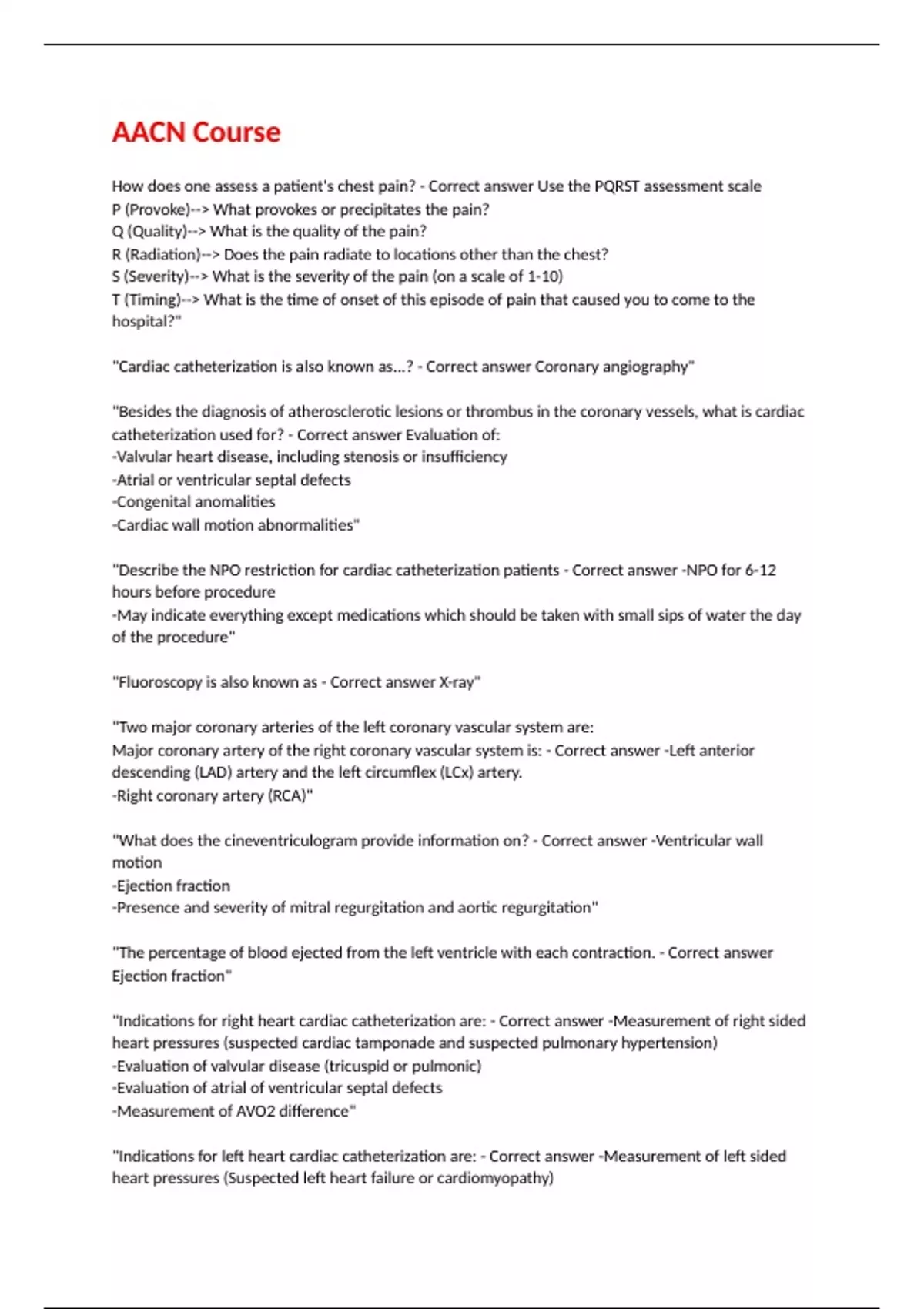AACN Course How does one assess a patient's chest pain? - Correct answer Use the PQRST assessment scale P (Provoke)-- What provokes or precipitates the pain? Q (Quality)-- What is the quality of the pain? R (Radiation)-- Does the pain radiate to locations other than the chest? S (Severity)-- What is the severity of the pain (on a scale of 1-10) T (Timing)-- What is the time of onset of this episode of pain that caused you to come to the hospital?" "Cardiac catheterization is also known as...? - Correct answer Coronary angiography" "Besides the diagnosis of atherosclerotic lesions or thrombus in the coronary vessels, what is cardiac catheterization used for? - Correct answer Evaluation of: -Valvular heart disease, including stenosis or insufficiency -Atrial or ventricular septal defects -Congenital anomalities -Cardiac wall motion abnormalities" "Describe the NPO restriction for cardiac catheterization patients - Correct answer -NPO for 6-12 hours before procedure -May indicate everything except medications which should be taken with small sips of water the day of the procedure" "Fluoroscopy is also known as - Correct answer X-ray" "Two major coronary arteries of the left coronary vascular system are: Major coronary artery of the right coronary vascular system is: - Correct answer -Left anterior descending (LAD) artery and the left circumflex (LCx) artery. -Right coronary artery (RCA)" "What does the cineventriculogram provide information on? - Correct answer -Ventricular wall motion -Ejection fraction -Presence and severity of mitral regurgitation and aortic regurgitation" "The percentage of blood ejected from the left ventricle with each contraction. - Correct answer Ejection fraction" "Indications for right heart cardiac catheterization are: - Correct answer -Measurement of right sided heart pressures (suspected cardiac tamponade and suspected pulmonary hypertension) -Evaluation of valvular disease (tricuspid or pulmonic) -Evaluation of atrial of ventricular septal defects -Measurement of AVO2 difference" "Indications for left heart cardiac catheterization are: - Correct answer -Measurement of left sided heart pressures (Suspected left heart failure or cardiomyopathy) -Evaluation of valvular disease (mitral or aortic) -Evaluation of atrial of ventricular septal defects -Diagnosis of obstructive coronary artery disease -Identification of lesion location prior to CABG surgery" "Cardiac catheterization with the addition of a balloon apparatus on the tip of the catheter for revascularizing the myocardium - Correct answer Percutaneous transluminal coronary angioplasty (PTCA)" "What is referred to as the acute coronary syndromes? - Correct answer AMI and unstable angina" "