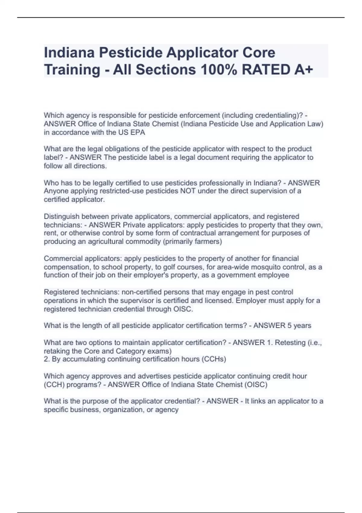 Which agency is responsible for pesticide enforcement (including credentialing)? - ANSWER Office of Indiana State Chemist (Indiana Pesticide Use and Application Law) in accordance with the US EPA What are the legal obligations of the pesticide applicator with respect to the product label? - ANSWER The pesticide label is a legal document requiring the applicator to follow all directions. Who has to be legally certified to use pesticides professionally in Indiana? - ANSWER Anyone applying restricted-use pesticides NOT under the direct supervision of a certified applicator. Distinguish between private applicators, commercial applicators, and registered technicians: - ANSWER Private applicators: apply pesticides to property that they own, rent, or otherwise control by some form of contractual arrangement for purposes of producing an agricultural commodity (primarily farmers) Commercial applicators: apply pesticides to the property of another for financial compensation, to school property, to golf courses, for area-wide mosquito control, as a function of their job on their employer's property, as a government employee Registered technicians: non-certified persons that may engage in pest control operations in which the supervisor is certified and licensed. Employer must apply for a registered technician credential through OISC. What is the length of all pesticide applicator certification terms? - ANSWER 5 years What are two options to maintain applicator certification? - ANSWER 1. Retesting (i.e., retaking the Core and Category exams) 2. By accumulating continuing certification hours (CCHs) Which agency approves and advertises pesticide applicator continuing credit hour (CCH) programs? - ANSWER Office of Indiana State Chemist (OISC) What is the purpose of the applicator credential? - ANSWER - It links an applicator to a specific business, organization, or agency - It confines the applicator to those applicatio