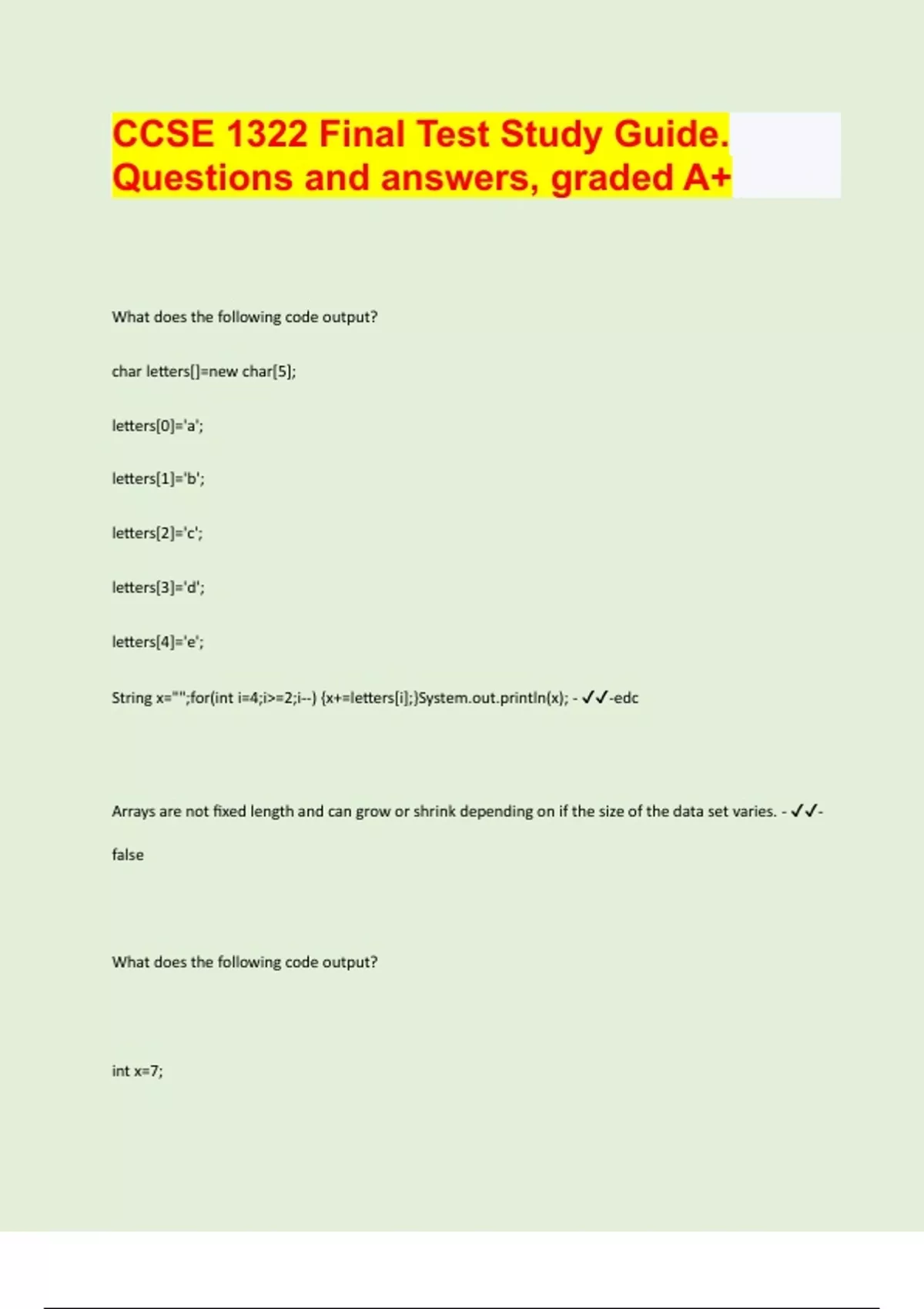 CCSE 1322 Final Test Study Guide. Questions and answers, graded A+ What does the following code output? char letters[]=new char[5]; letters[0]='a'; letters[1]='b'; letters[2]='c'; letters[3]='d'; letters[4]='e'; String x="";for(int i=4;i>=2;i--) {x+=letters[i];}Sln(x); - -edc Arrays are not fixed length and can grow or shrink depending on if the size of the data set varies. - - false What does the following code output? int x=7; int y=10;i f((x>5) && (y>12)) {Sln("A"); } else if((x<7) || (y>10)) { Sln("B"); } else if((x<=14) && (y>2)) { Sln("C"); } else {Sln("D"); } - -C int x=10; for(int i=5;i<0;i--) { x++; } Sln(x); - -10 What is the maximum number of constructors a class can have? - -many class House { public int square_footage; public int stories; public House() { square_footage=0; stories=1;} public House(int sf, int s) { square_footage=sf;stories=s; } } - -House h1=new House(1500,1,1); How many parameters does a default constructor have? - -0 Constructor can return a value - -false class Stuff { public int number=1; } class Main { public static void main(String[] args) { Stuff myStuff = new Stuff(); mySr+=3; Sln("mySr:"+mySr); myStuff newStuff(); Sln("mySr:"+mySr); } } - -mySr:4 mySr:1 class Main { public static void swap(String str1, String str2) { String holdString; holdString = str1; str1 = str2; str2 = holdString; } public static void main(String[] args) { String s1 = "Computers"; String s2 = "Rock"; swap(s1, s2); Sln(s1+" "+s2); } } - -Computers Rock class Main { public static void addtwo(int[] numArray) { numArray[0]+=2; } public static void main(String[] args)
