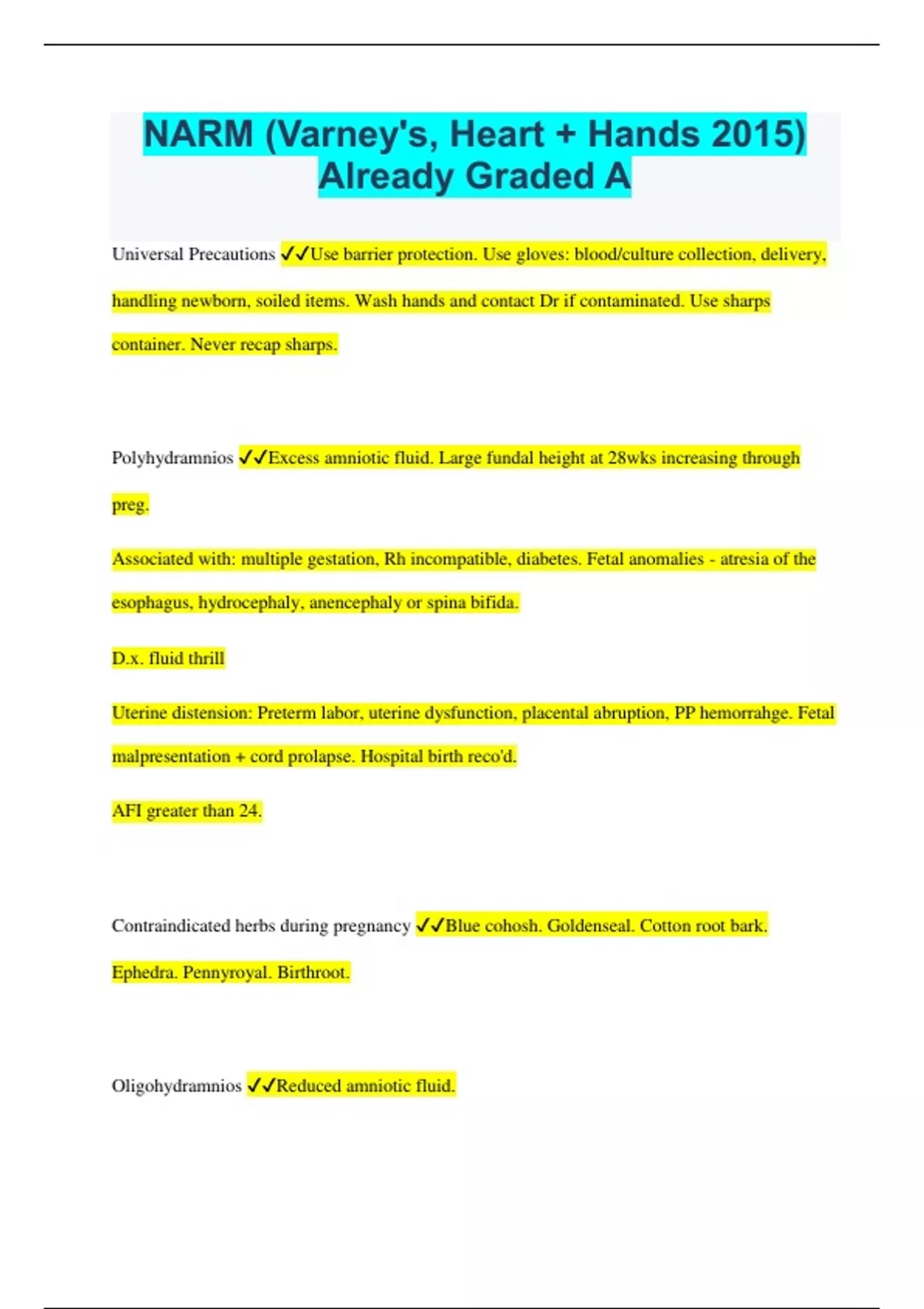 NARM (Varney's, Heart + Hands 2015) Already Graded A Universal Precautions Use barrier protection. Use gloves: blood/culture collection, delivery, handling newborn, soiled items. Wash hands and contact Dr if contaminated. Use sharps container. Never recap sharps. Polyhydramnios Excess amniotic fluid. Large fundal height at 28wks increasing through preg. Associated with: multiple gestation, Rh incompatible, diabetes. Fetal anomalies - atresia of the esophagus, hydrocephaly, anencephaly or spina bifida. D.x. fluid thrill Uterine distension: Preterm labor, uterine dysfunction, placental abruption, PP hemorrahge. Fetal malpresentation + cord prolapse. Hospital birth reco'd. AFI greater than 24. Contraindicated herbs during pregnancy Blue cohosh. Goldenseal. Cotton root bark. Ephedra. Pennyroyal. Birthroot. Oligohydramnios Reduced amniotic fluid. Associated with: S.G.A., I.U.G.R., Postdatism. Fetal mortality due to IUGR, postmaturity syndrome, congenital anomalies. Cord compression. fetal distress and hypoxia in labor. + hydration, and r/o other problems. AFI less than 5.0 Large uterus measurement for dates Polyhydramnios, mulptiples, L.G.A Multiple Pregnancy / twins Large for dates fundal measurements. Palpate many parts. R/o L.G.A dx: 28-32 wks. Two heartbeats. Ultrasound. Dizygotic - fraternal. Two eggs and two sperms. Two placentas and two sacs. Monozygotic - identical. One egg and one sperm. One placenta and one or two sacs. Risks: anemia. Nutrition. Rest. TTTS. Cord prolapse. Hypoxia. Placenta abruption. PP hemorrhage. CPD (cephalopelvic disproportion) is the greatest risk in a breech birth because ... after the body is born, the head might not fit through the pelvis. Breech risks CPD - leads to fetal hypoxia - leads to mortality. Cord prolapse. To deliver breech safely at home Frank or Complete. Anterior or Transverse position. Well-flexed head. Gynecoid pelvis. Average sized baby. Newborn with HBV+ mom Needs a Hep B vaccines - HBV and HBIG - within 12 hrs of birth. Can an HIV+ mom breastfeed? No - infection can be transmitted through breastmilk GBS profylaxis during labor Penicillin, ampicillin or cefazolin q 4hrs through the hours of labor before birth. Observe newborn 48hrs for s/s GBS Most fetuses are in vertex position by 35-36 wks gest