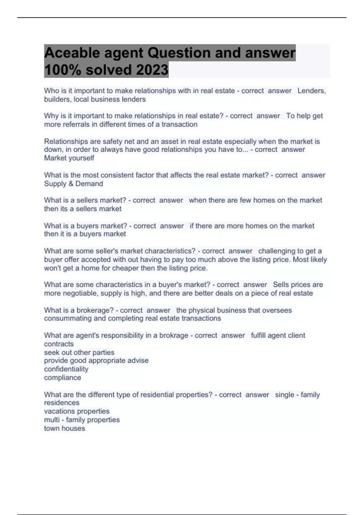 Aceable agent Parties Relationship Question with Respective Solutions 2023/2024 Who is it important to make relationships with in real estate - correct answer Lenders, builders, local business lenders Why is it important to make relationships in real estate? - correct answer to help get more referrals in different times of a transaction Relationships are safety net and an asset in real estate especially when the market is down, in order to always have good relationships you have to... - correct answer Market yourself What is the most consistent factor that affects the real estate market? - correct answer Supply & Demand What is a sellers market? - correct answer when there are few homes on the market then its a sellers market What is a buyers market? - correct answer if there are more homes on the market then it is a buyers market What are some seller's market characteristics? - correct answer challenging to get a buyer offer accepted with out having to pay too much above the listing price. Most likely won't get a home for cheaper then the listing price. What are some characteristics in a buyer's market? - correct answer Sells prices are more negotiable, supply is high, and there are better deals on a piece of real estate What is a brokerage? - correct answer the physical business that oversees consummating and completing real estate transactions What are agent's responsibility in a brokrage - correct answer fulfill agent client contracts seek out other parties provide good appropriate advise confidentiality compliance What are the different type of residential properties? - correct answer single - family residences vacations properties multi - family properties town houses condominiums apartment buildings manufactured homes