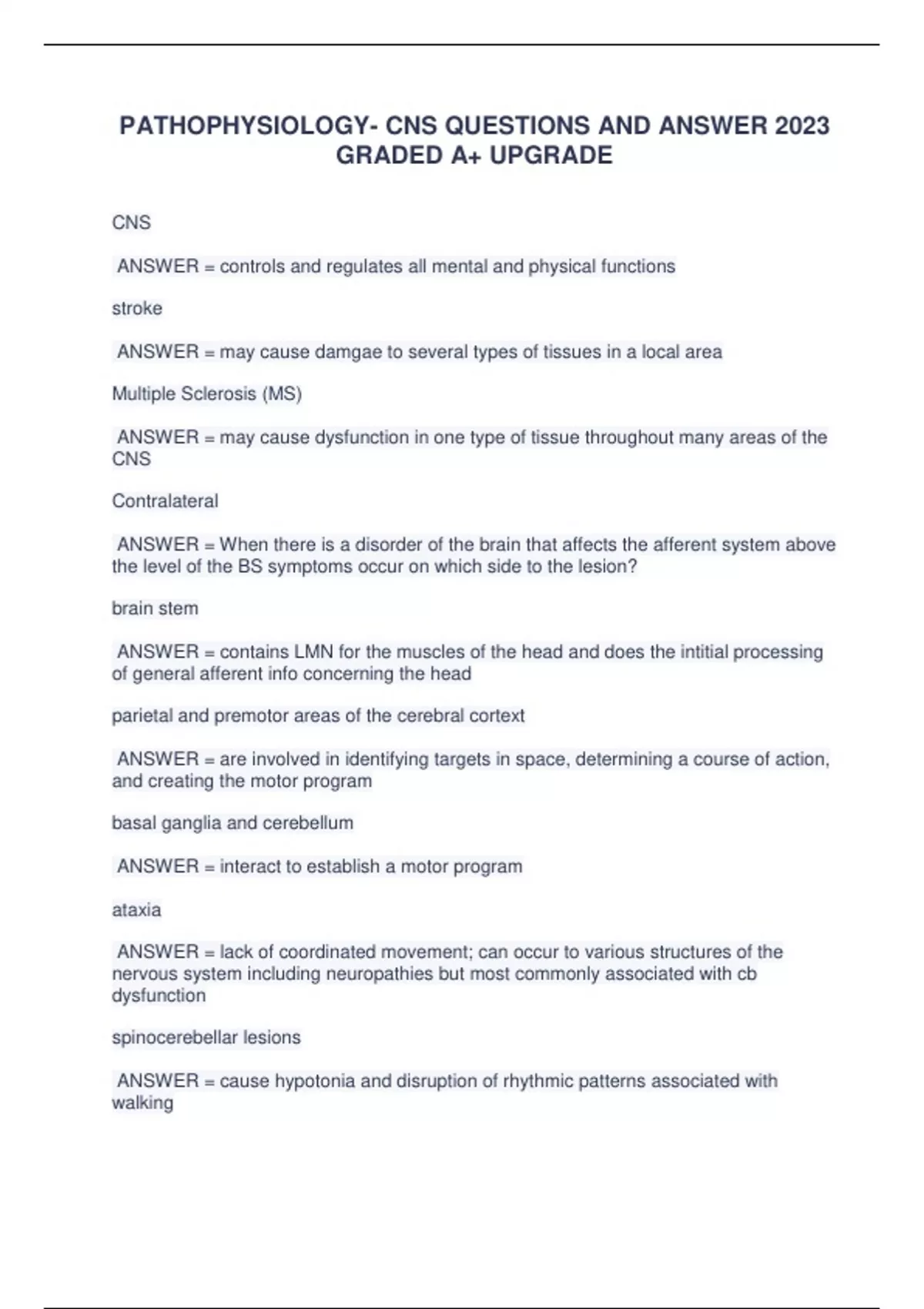 PATHOPHYSIOLOGY- CNS QUESTIONS AND ANSWER 2023 GRADED A+ UPGRADE