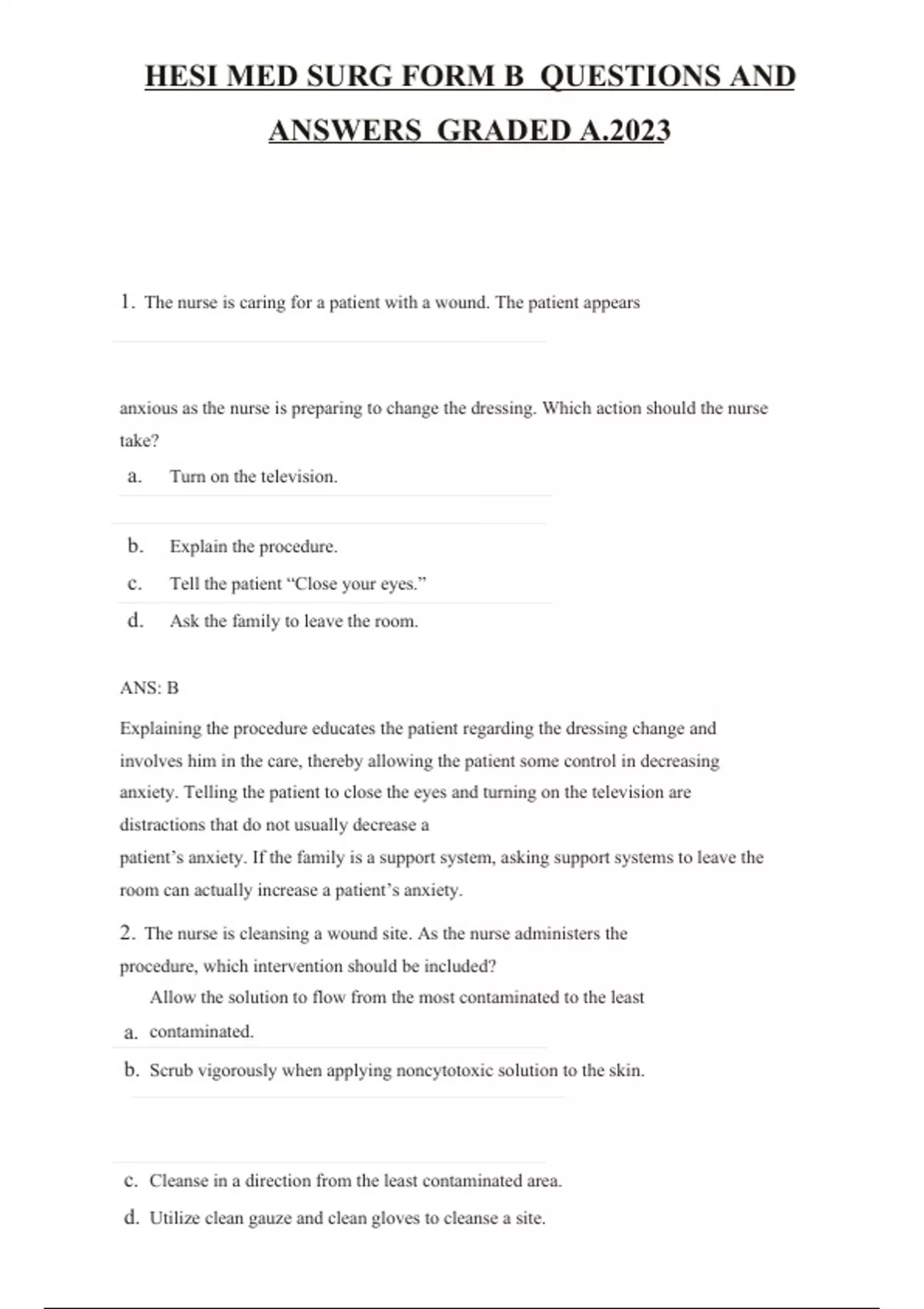 1. The nurse is caring for a patient with a wound. The patient appears anxious as the nurse is preparing to change the dressing. Which action should the nurse take? a. Turn on the television. b. Explain the procedure. c. Tell the patient “Close your eyes.” d. Ask the family to leave the room. ANS: B Explaining the procedure educates the patient regarding the dressing change and involves him in the care, thereby allowing the patient some control in decreasing anxiety. Telling the patient to close the eyes and turning on the television are distractions that do not usually decrease a patient’s anxiety. If the family is a support system, asking support systems to leave the room can actually increase a patient’s anxiety. 2. The nurse is cleansing a wound site. As the nurse administers the procedure, which intervention should be included? Allow the solution to flow from the most contaminated to the least a. contaminated. b. Scrub vigorously when applying noncytotoxic solution to the skin. CHAMBERLAIN COLLEGE HESI MED SURG FORM B QUESTIONS AND ANSWERS GRADED A.VSU 2023.Qualified c. Cleanse in a direction from the least contaminated area. d. Utilize clean gauze and clean gloves to cleanse a site. ANS: C Cleanse in a direction from the least contaminated area, such as from the wound or incision, to the surrounding skin. While cleansing surgical or traumatic wounds by applying noncytotoxic solution with sterile gauze or by irrigations is correct, vigorous scrubbing is inappropriate and can cause damage to the skin. Use gentle friction when applying solutions to the skin, and allow irrigation to flow from the least to the most contaminated area. 3. The nurse is caring for a patient after an open abdominal aortic aneurysm repair. The nurse requests an abdominal binder and carefully applies the binder. Which is the best explanation for the nurse to use when 1 teaching the patient the reason for the binder? CHAMBERLAIN COLLEGE HESI MED SURG FORM B QUESTIONS AND ANSWERS GRADED A.VSU 2023.Qualified a. It reduces edema at the surgical site. b. It secures the dressing in place. c. It immobilizes the abdomen. d. It supports the abdomen. ANS: D The patient has a large abdominal incision. This incision will need support, and an abdominal binder will support this wound, especially during movement, as well as during deep breathing and coughing. A binder can be used to immobilize a body part (e.g., an elastic bandage applied around a sprained ankle). A binder can be used to prevent edema, for example, in an extremity but in this case is not used to reduce edema at a surgical site. A binder can be used to secure dressings such as elastic webbing applied around a leg after vein stripping. 4. The nurse is caring for a postoperative medial meniscus repair of the right knee. Which action should the nurse take to assist with pain management? a. Monitor vital signs every 15 minutes. b. Check pulses in the right foot. c. Keep the leg dependent. d. Apply ice. ANS: D Ice assists in preventing edema formation, controlling bleeding, and anesthetizing the body part. Elevation (not dependent) assists in preventing edema, which in turn can cause pain. Monitoring vital signs every 15 minutes is routine postoperative care and includes a pain assessment but in itself is not an intervention that decreases pain. Checking the pulses CHAMBERLAIN COLLEGE HESI MED SURG FORM B QUESTIONS AND ANSWERS GRADED A.VSU 2023.Qualified is important to monitor the circulation of the extremity but in itself is not a pain management intervention. 5. The patient has a risk for skin impairment and has a 15 on the Braden Scale upon admission. The nurse has implemented interventions. Upon reassessment, which Braden score will be the best sign that the risk for skin breakdown is removed? a. 12 b. 13 2 c. 20 CHAMBERLAIN COLLEGE HESI MED SURG FORM B QUESTIONS AND ANSWERS GRADED A.VSU 2023.Qualified d. 23 ANS: D The best sign is a perfect score of 23. The Braden Scale is composed of six subscales: sensory perception, moisture, activity, mobility, nutrition, and friction and shear. The total score ranges from 6 to 23, and a lower total score indicates a higher risk for pressure ulcer development. The cutoff score for onset of pressure ulcer risk with the Braden Scale in the general adult population is 18. MULTIPLE RESPONSE 1. The nurse is caring for a patient with a surgical incision that eviscerates. Which actions will the nurse take? (Select all that apply.) a. Place moist sterile gauze over the site. b. Gently place the organs back. c. Contact the surgical team. d. Offer a glass of water. e. Monitor for shock. ANS: A, C, E