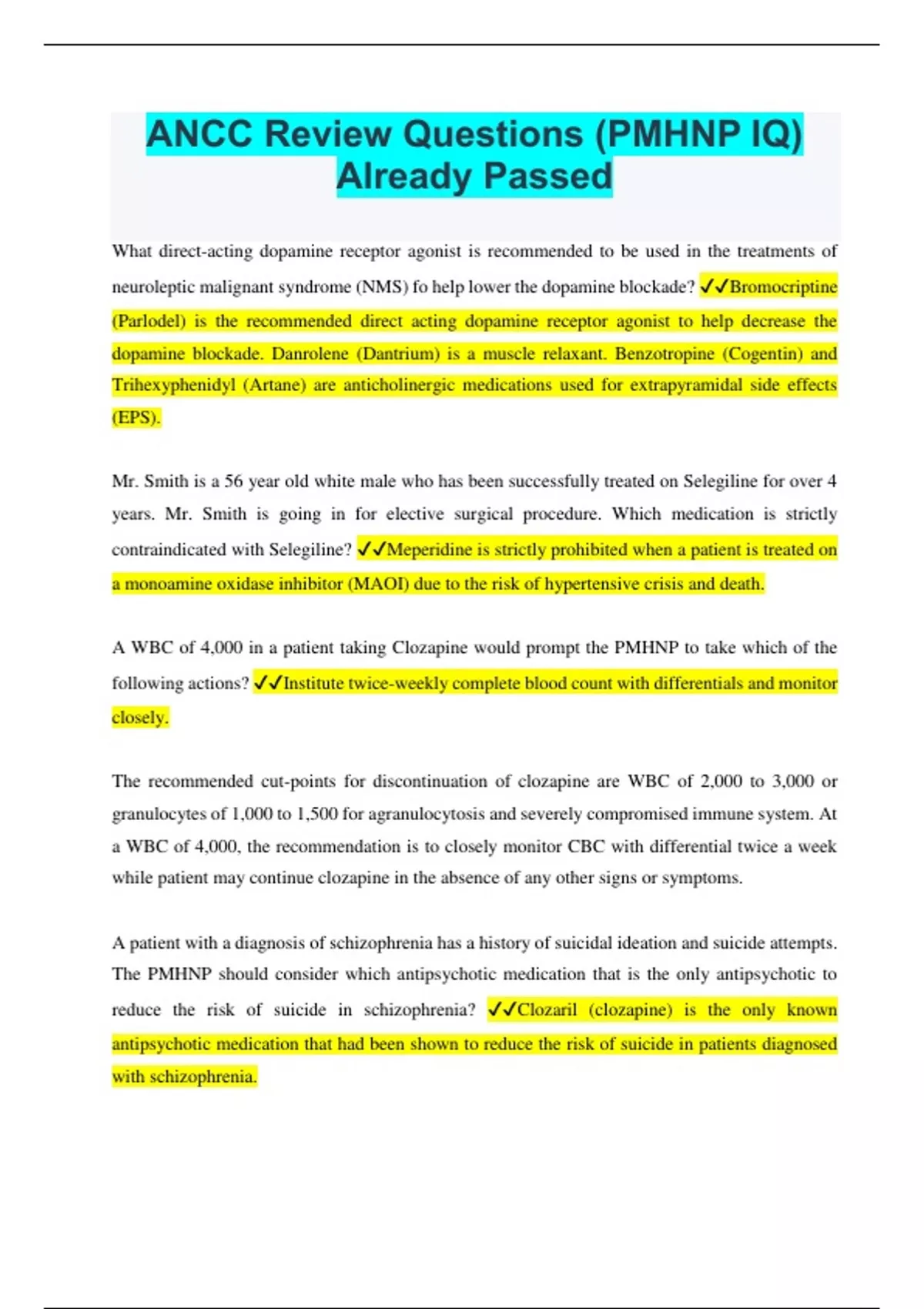 ANCC Review Questions (PMHNP IQ) Already Passed